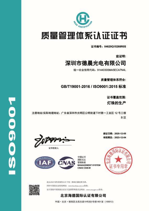 质量目标——客户的全面满意,服务态度——信守承诺、以诚相待,工作作风— —积极务实,团结高效,开拓创新.公司严格按照ISO9001 -2008质量管理体系运作,公司经营宗旨“以人为本,锐意进取,诚信兴业”.的经营理念赢取客户信任,为客户创造价值,用心点亮世界,让爱传递光明!