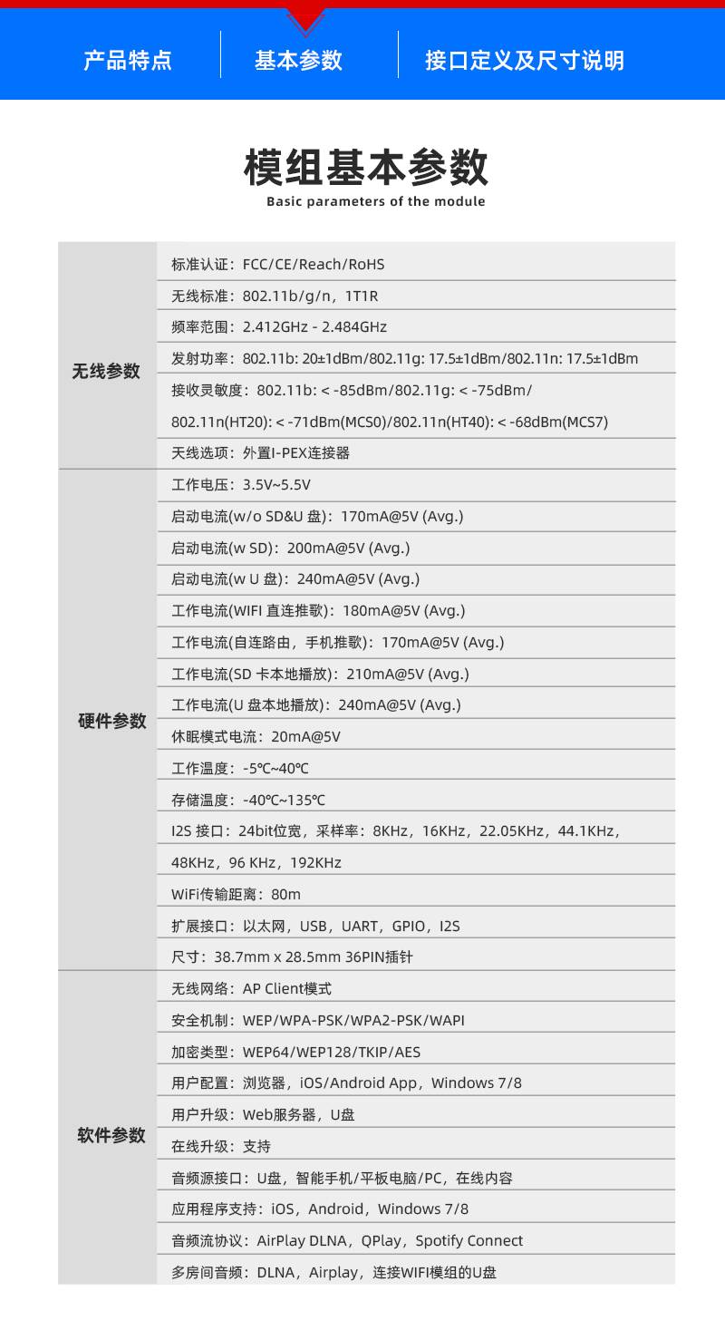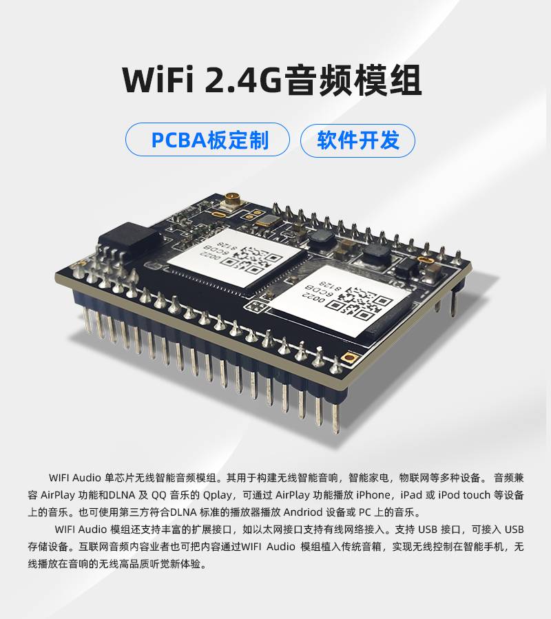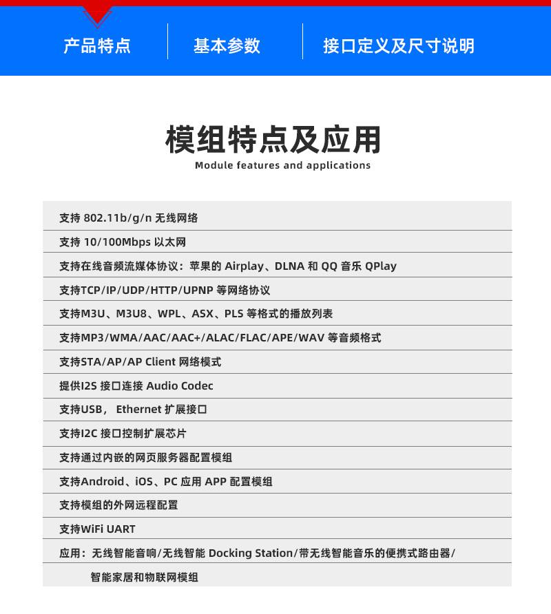 WIFI Audio单芯片无线智能音频模组。其用于构建无线智能音响,智能家电,物联网等多种设备。音频兼容AirPlay功能和DLNA及QQ音乐的Qplay,可通过AirPlay功能播放iPhone, iPad或iPod touch等设备上的音乐。也可使用第三方符合DLNA标准的播放器播放 Andriod 设备或PC上的音乐。