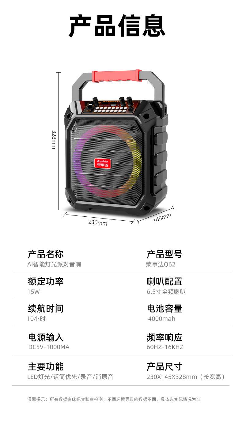 荣事达Q62智能AI炫彩灯光声卡特效广场舞户外K歌音响
