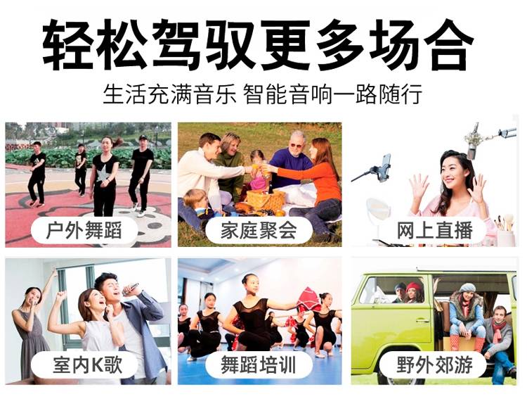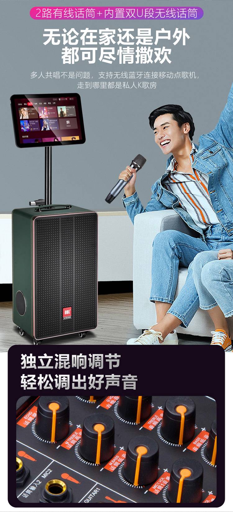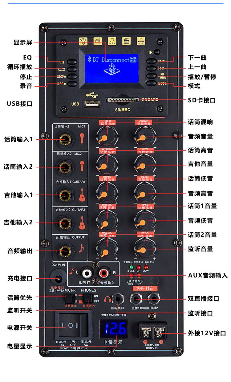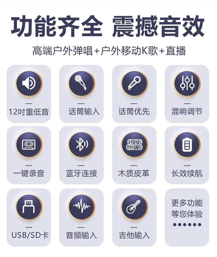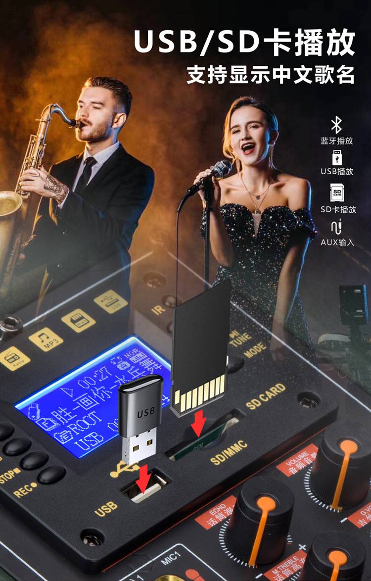 *支持USB/SD/FM/MP3及AUX多种信号输入连接,独立音乐高中低音调节,支持卡拉OK演唱、消原音、话筒优先、录音、循环播放、监听及吉他弹唱、手机直播都多功能于一体