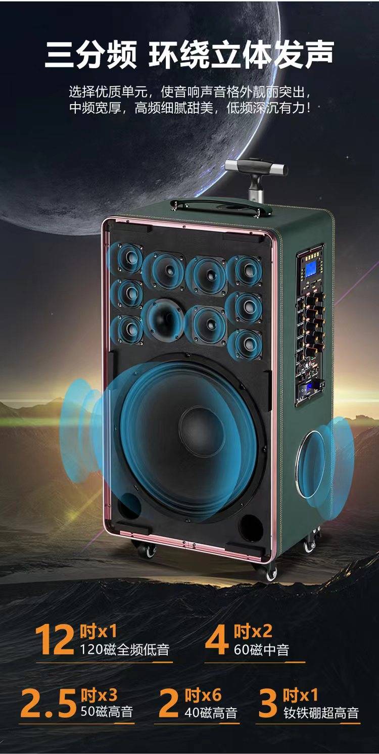 12寸四分频大功率高端户外弹唱+直播音响,高密度中纤板烤漆箱体,纯手工制作,专利外观,时尚大气。