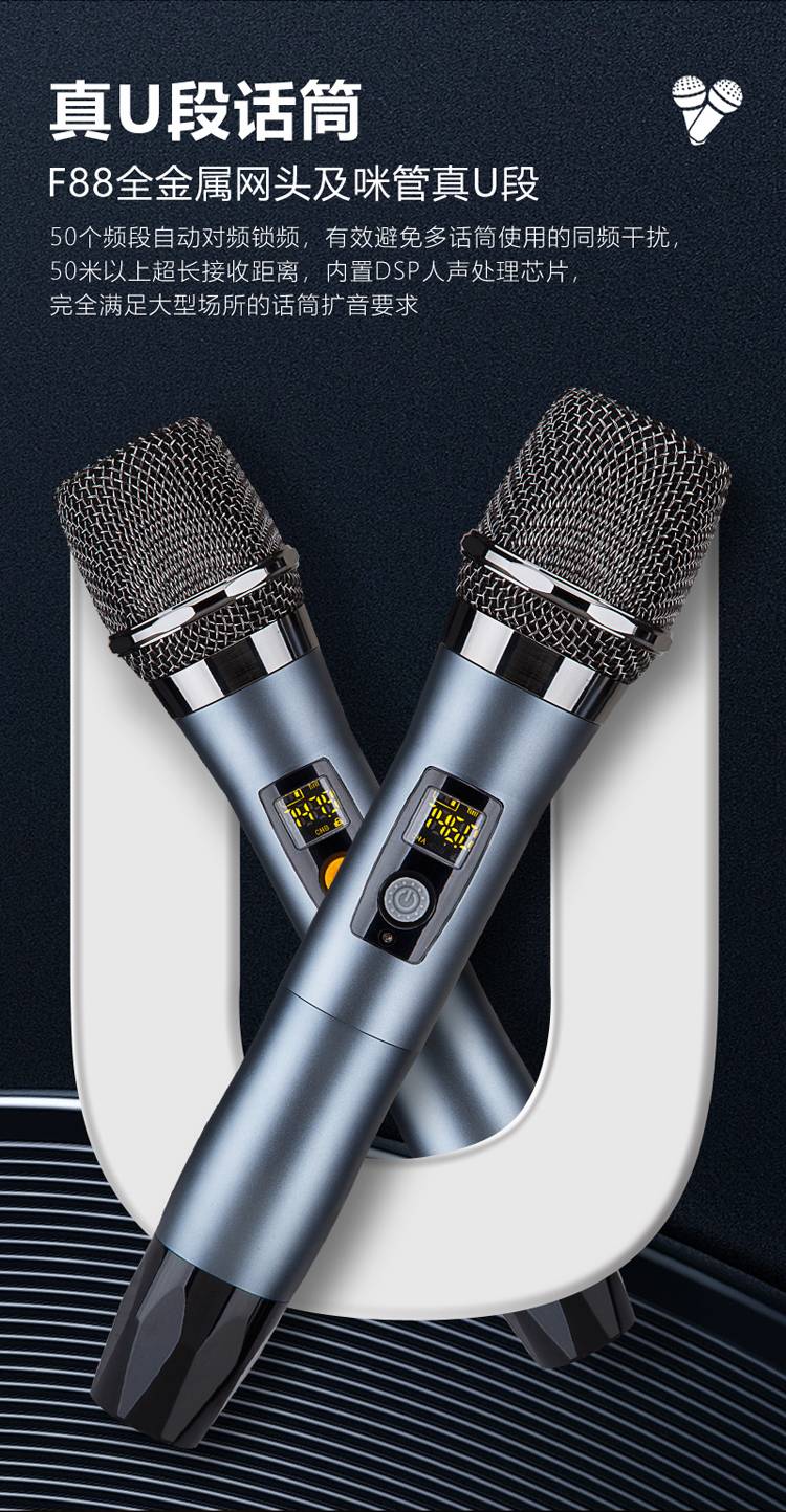 全金属无线F88话筒:高品质U段无线话筒,50个频段自动对频锁频,有效避免多话筒使用的同频干扰,50米以上超长接收距离,内置DSP人声处理芯片,完全满足大型场所的话筒扩音要求