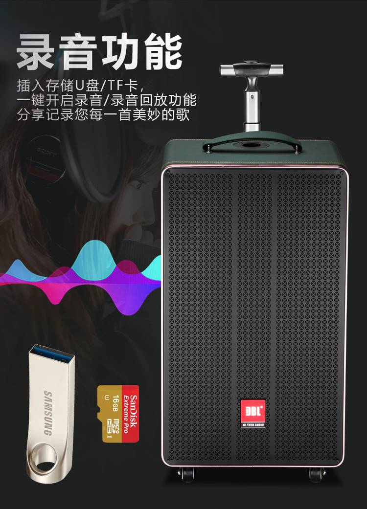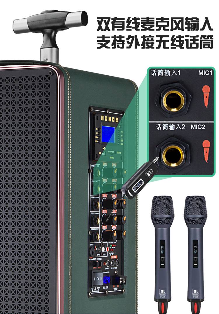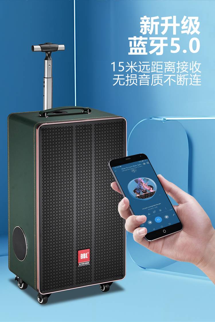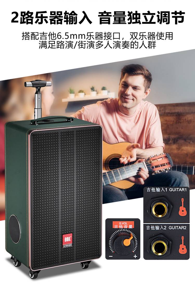 *蓝牙5.0版本,15米以上超长距离接收,音质完美不断点;*专业级别三分频电路设计,内置DSP声效模块,音质优美;*智能充放电管理系统,全数码电量显示,直观方便;*两路有线话筒接口+2个无线话筒,话筒高中低音独立调节*两路吉他/乐器接口,乐器高中低音独立调节*两路直播接口及一组耳机监听接口,随时随地可现场直播*150W超大功率方案设计,特有等功率副箱输出,支持升级副箱连接,可根据需要组建大型演唱组合音响系统,功率更大,声场更广阔。