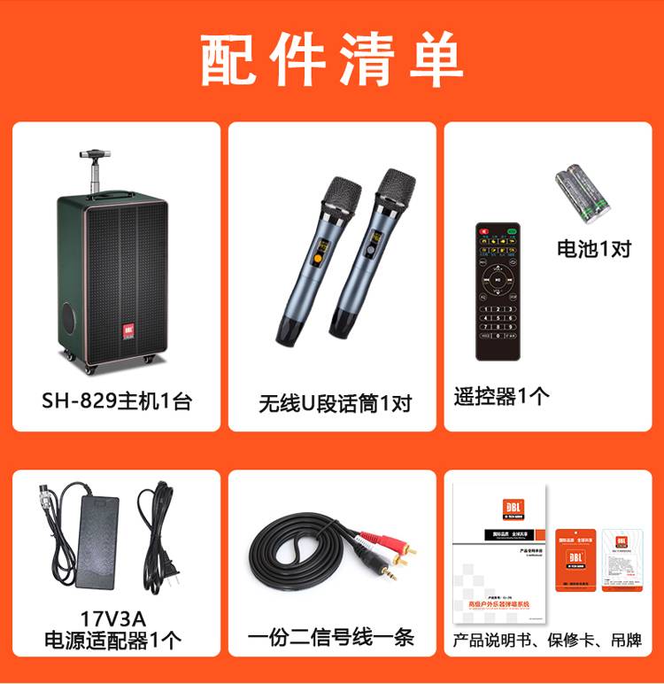标配:主机一台,U段话筒一对,遥控器1个,天线2条,品字3插电源线一条,一份二信号线一条,说明书、保修卡、吊牌