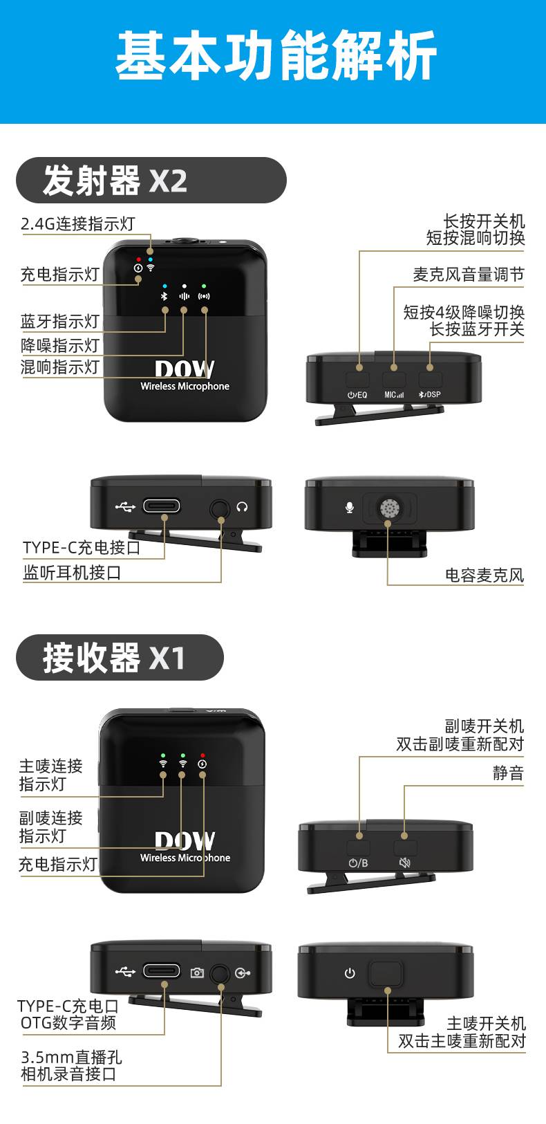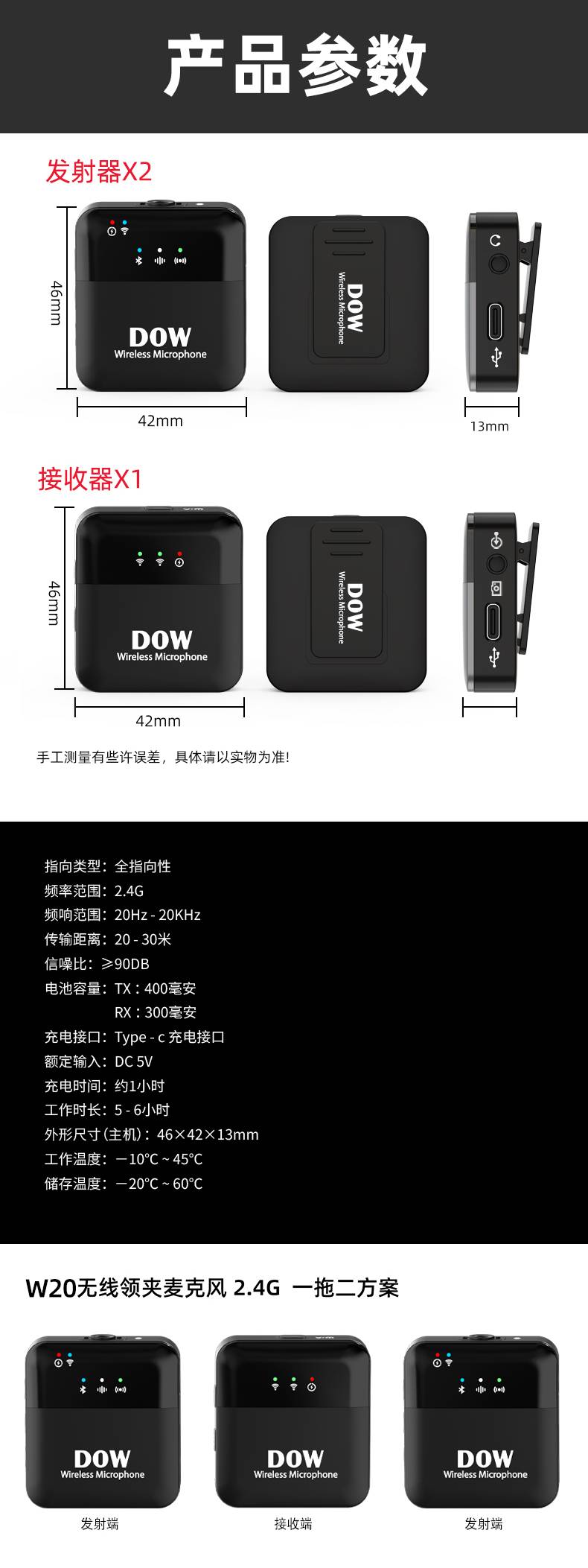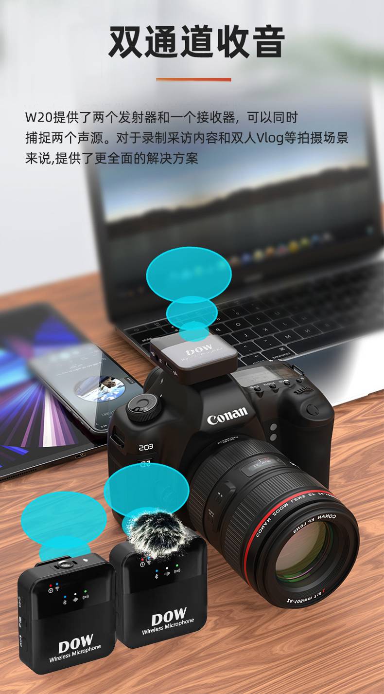 多维无线领夹麦克风W20一拖二Vlog拍视频做直播打PK双向通话2.4G无线蓝牙伴奏混响K歌