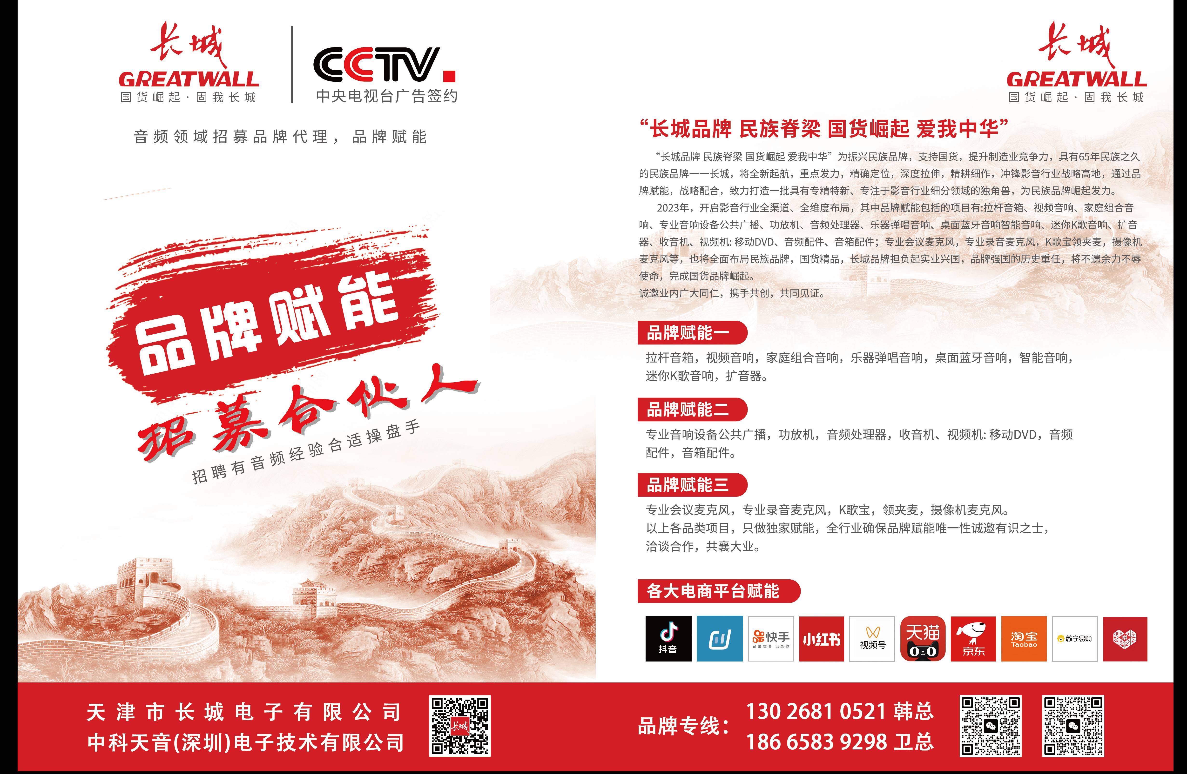 2023年,开启影音行业全渠道、全维度布局,其中品牌赋能包括的项目有:拉杆音箱、视频音响、家庭组合音响、专业音响设备公共广播、功放机、音频处理器、乐器弹唱音响、桌面蓝牙音响智能音响、迷你K歌音响、扩音器、收音机、视频机:移动DVD、音频配件、音箱配件专业会议麦克风,专业录音麦克风,K歌宝领夹麦,摄像机麦克风等,也将全面布局民族品牌,国货精品,长城品牌担负起实业兴国,品牌强国的历史重任,将不遗余力不辱使命,完成国货品牌崛起。诚邀业内广大同仁,携手共创,共同见证。