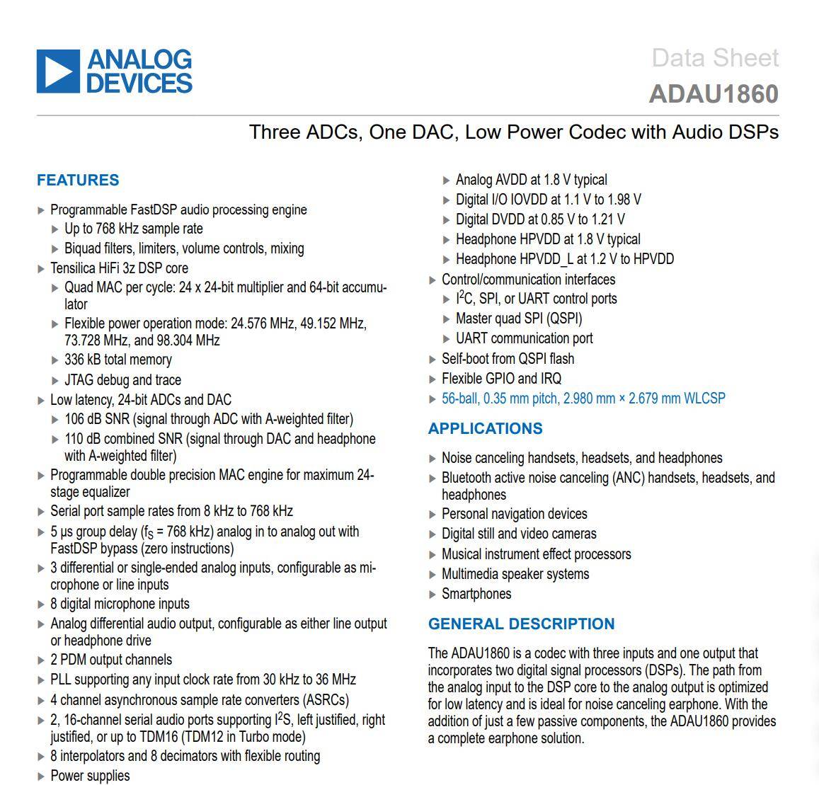 • Programmable FastDSP audio processing engine• Up to 768 kHz sample rate• Biquad filters, limiters, volume controls, mixing • Tensilica HiFi 3z DSP core• Quad MAC per cycle: 24 x 24-bit multiplier and 64-bit accumulator• Flexible power operation mode: 24.576 MHz, 49.152 MHz, 73.728 MHz, and 98.304 MHz• 336 kB total memory• JTAG debug and trace• Low latency, 24-bit ADCs and DAC• 106 dB SNR (signal through ADC with A-weighted filter)• 110 dB combined SNR (signal through DAC and headphone with A-weighted filter)• Programmable double precision MAC engine for maximum 24-stage equalizer• Serial port sample rates from 8 kHz to 768 kHz• 5 μs group delay (fS = 768 kHz) analog in to analog out with FastDSP bypass (zero instructions)• 3 differential or single-ended analog inputs, configurable as microphone or line inputs• 8 digital microphone inputs• Analog differential audio output, configurable as either line output or headphone drive• 2 PDM output channels• PLL supporting any input clock rate from 30 kHz to 36 MHz• 4 channel asynchronous sample rate converters (ASRCs)• 2, 16-channel serial audio ports supporting I2S, left justified, right justified, or up to TDM16 (TDM12 in Turbo mode)• 8 interpolators and 8 decimators with flexible routing• Power supplies• Analog AVDD at 1.8 V typical• Digital I/O IOVDD at 1.1 V to 1.98 V• Digital DVDD at 0.85 V to 1.21 V• Headphone HPVDD at 1.8 V typical• Headphone HPVDD_L at 1.2 V to HPVDD• Control/communication interfaces• I2C, SPI, or UART control ports• Master quad SPI (QSPI)• UART communication port• Self-boot from QSPI flash• Flexible GPIO and IRQ• 56-ball, 0.35 mm pitch, 2.980 mm × 2.679 mm WLCSP