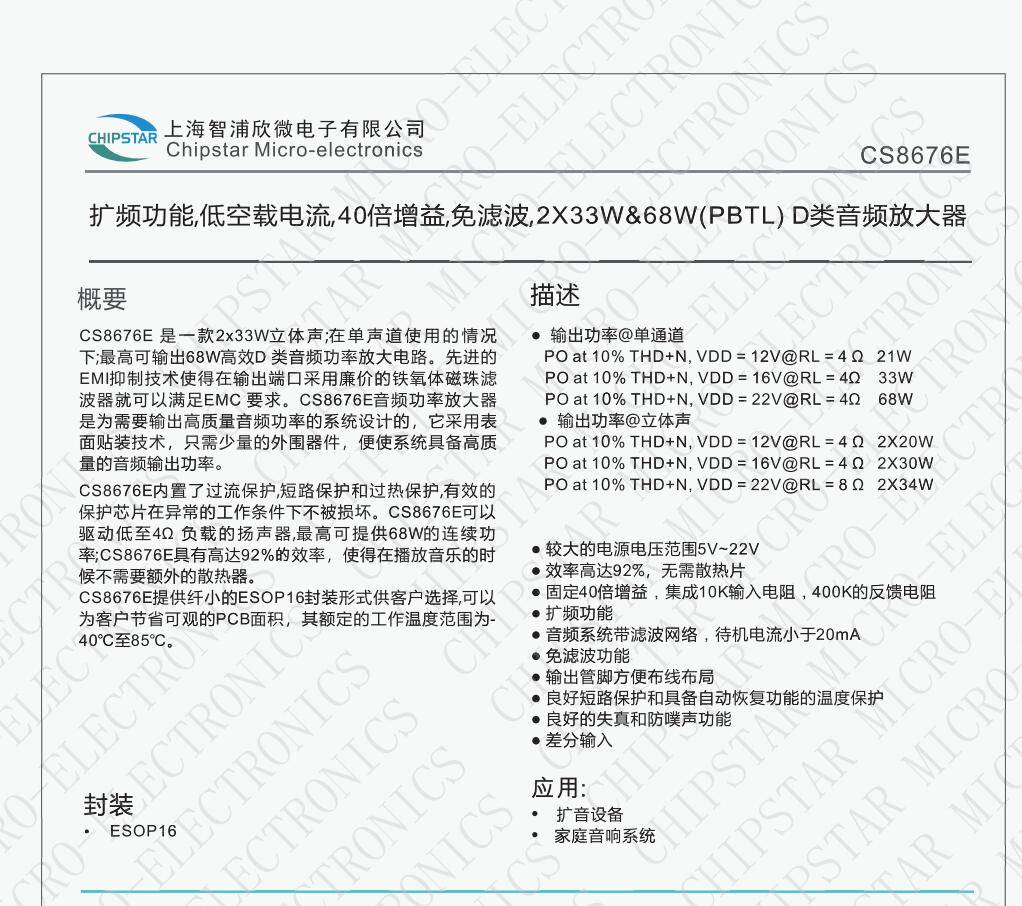 CS8676E 智浦欣 2X20W双声道/40W单声道D类音频功放IC