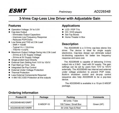AD22654-MH10NAR AD22654是一款3-Vrms无盖立体声线路驱动器 MSOP10