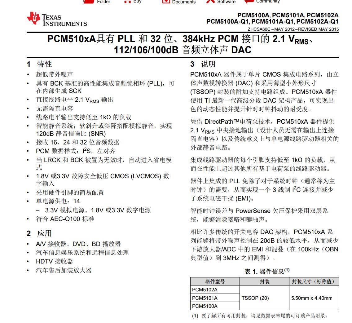 PCM510xA 器件属于单片 CMOS 集成电路系列,由立体声数模转换器 (DAC) 和采用薄型小外形尺寸 (TSSOP) 封装的附加支持电路组成。PCM510xA 器件使用 TI 最新一代高级分段 DAC 架构产品,可实现出色的动态性能并提升针对时钟抖动的耐受度。 凭借 DirectPath电荷泵技术,PCM510xA 器件提供 2.1 VRMS 中央接地输出(设计人员无需在输出上连接隔直电容)以及传统意义上与单电源线路驱动器相关的外部静音电路。集成线路驱动器的每个引脚支持低至 1kΩ 的负载,从而在性能上超过其他所有基于电荷泵的线路驱动器。器件上集成的 PLL 免除了对于系统时钟(通常称为主时钟)的需要,从而实现一个 3 线制 I2C 连接并减少了系统电磁干扰 (EMI)。 智能时钟误差与 PowerSense 欠压保护采用双层系统,能够消除喀嗒和噼啪声。 相比许多传统的开关电容 DAC 架构,PCM510xA 系列能够将带外噪声控制在 20dB 的较低水平,从而减少下游放大器/ADC 中的 EMI 和混叠(在 100kHz(OBN 典型值)到 3MHz 之间测得)。