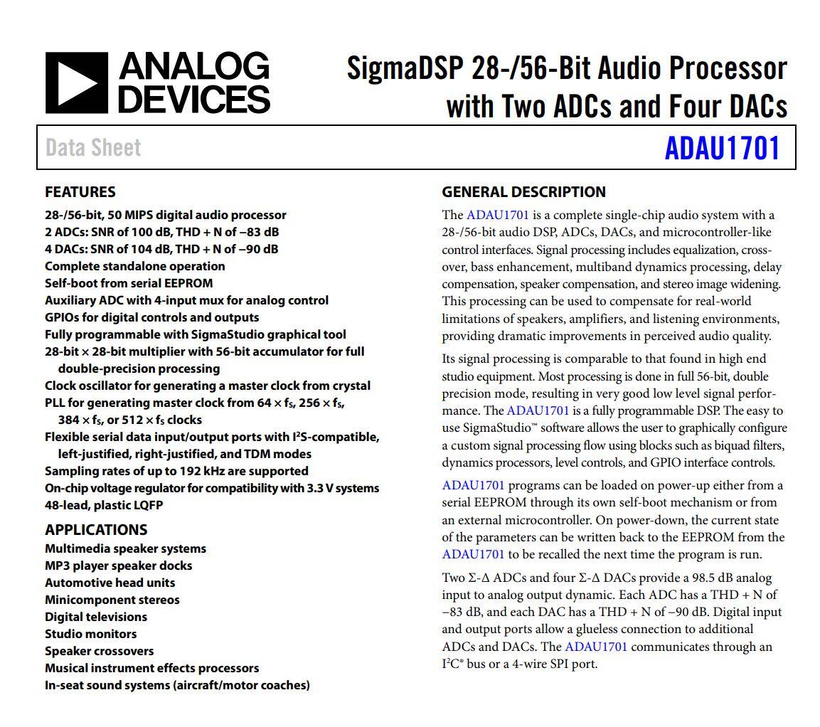 DAU1701是一款28/56 bit音频DSP、ADC、DAC以及类似微控制器的控制接口。