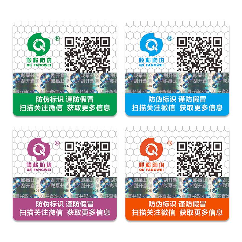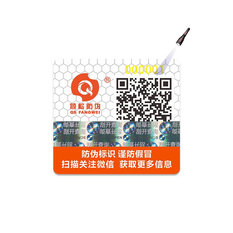 一物一码防伪标,每个标签不一样二维码,像身份证一样。隐形荧光防伪,内部检测真假。环保镭射涂层,不仅环保还带防伪码,而且耐磨耐蹭不脏手。