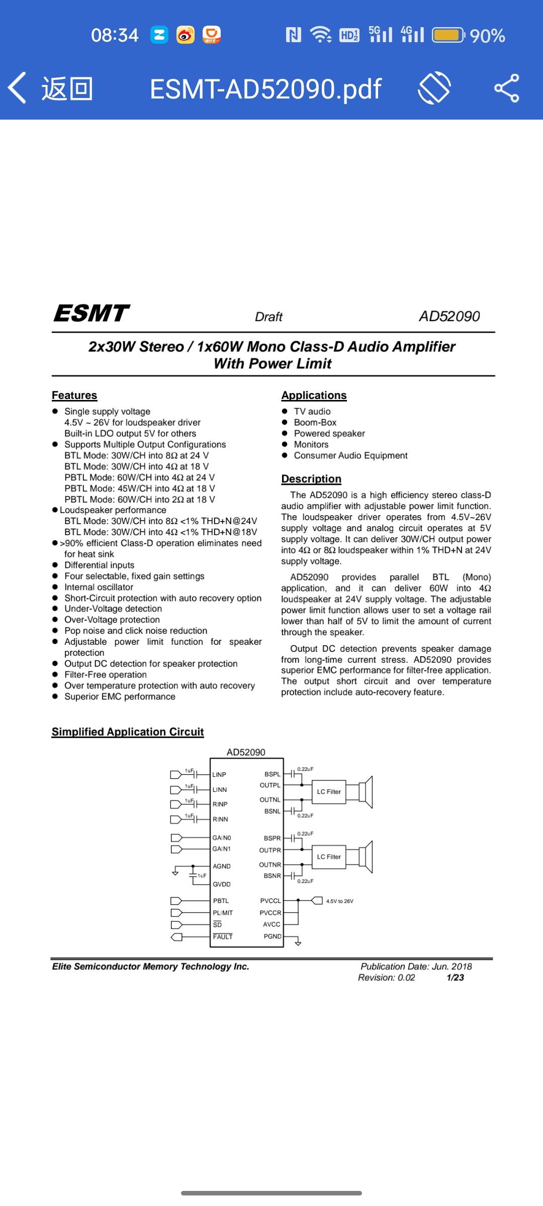 AD52090 晶豪台湾原装全新正品ESMT 60W 音频功放IC