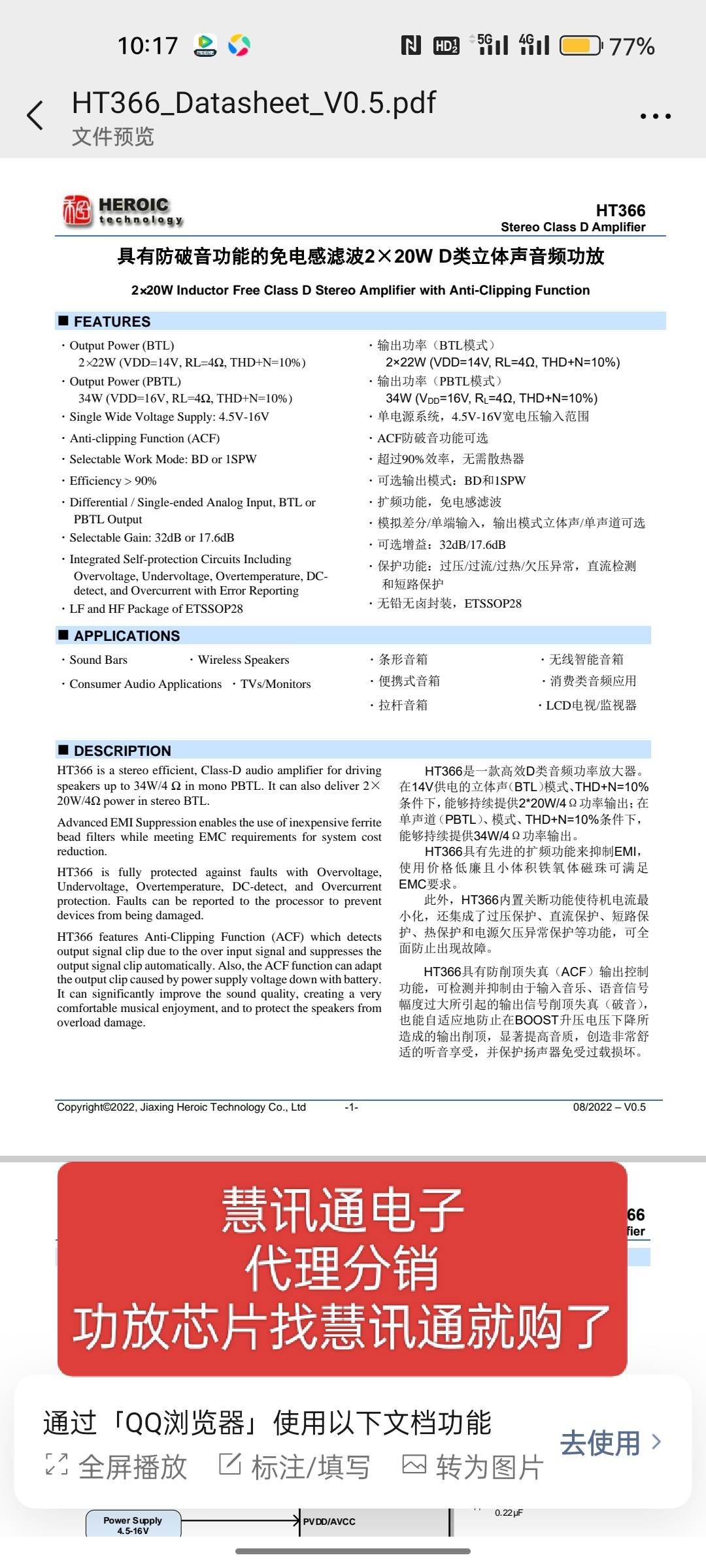 HT366 禾润 2*20W 免电感功放音频芯片IC