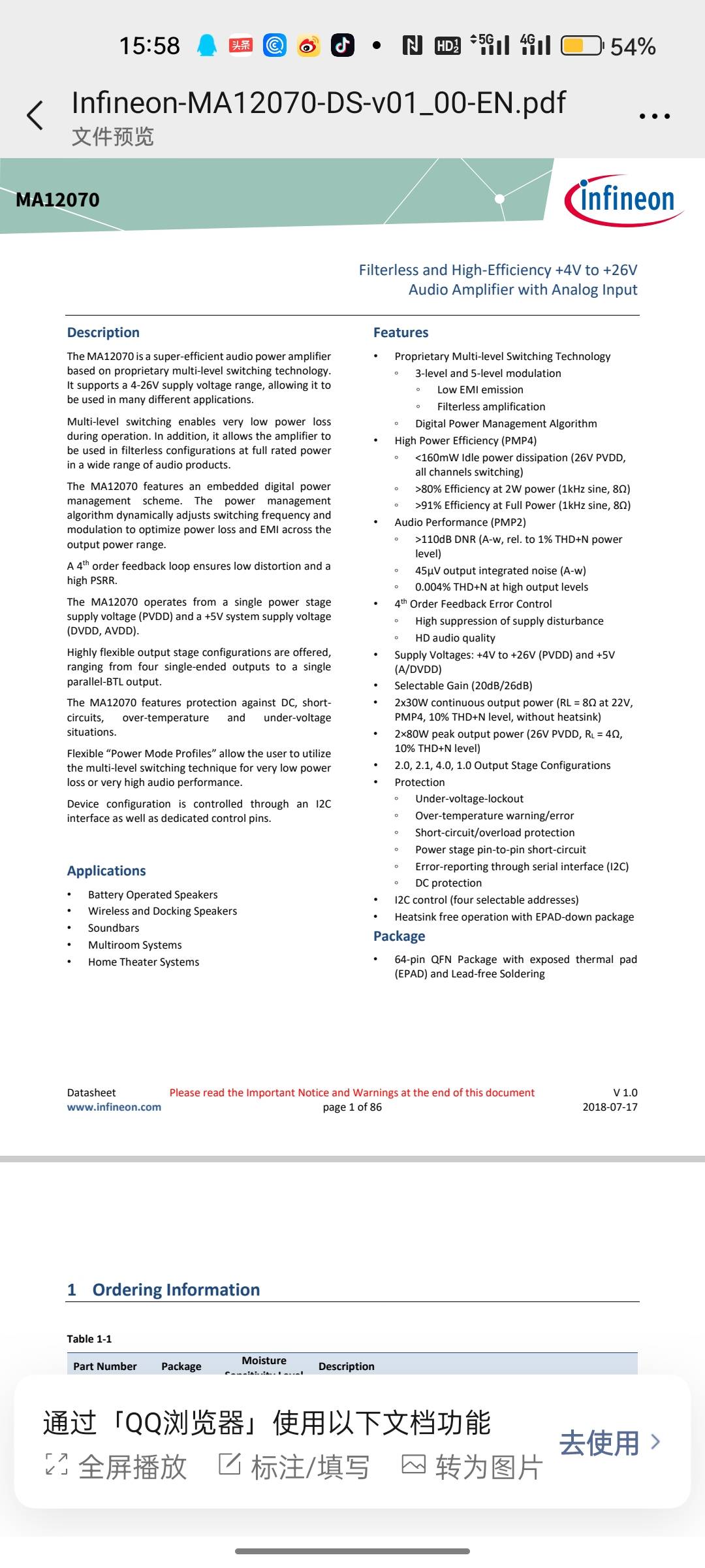 MA12070P infineon 2*80W 数字功放芯片 64pin