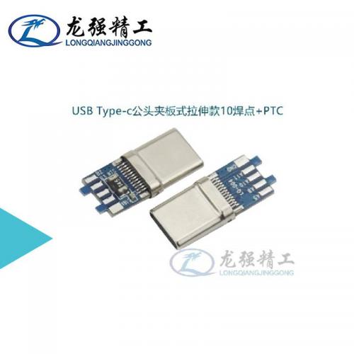 USB Type-c公头夹板式拉伸款10焊点+PTC