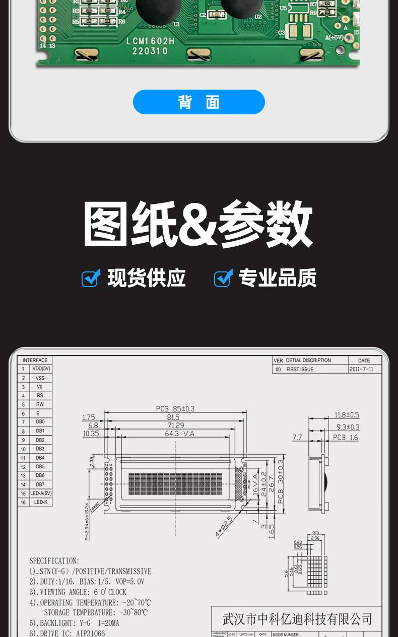 LCM1602A液晶屏LCD1602液晶显示模块 5v3.3V蓝/黄绿屏带背光80*36
