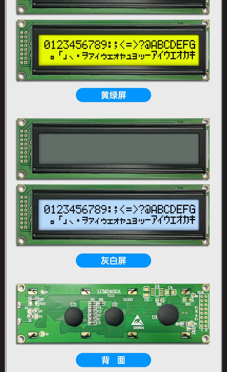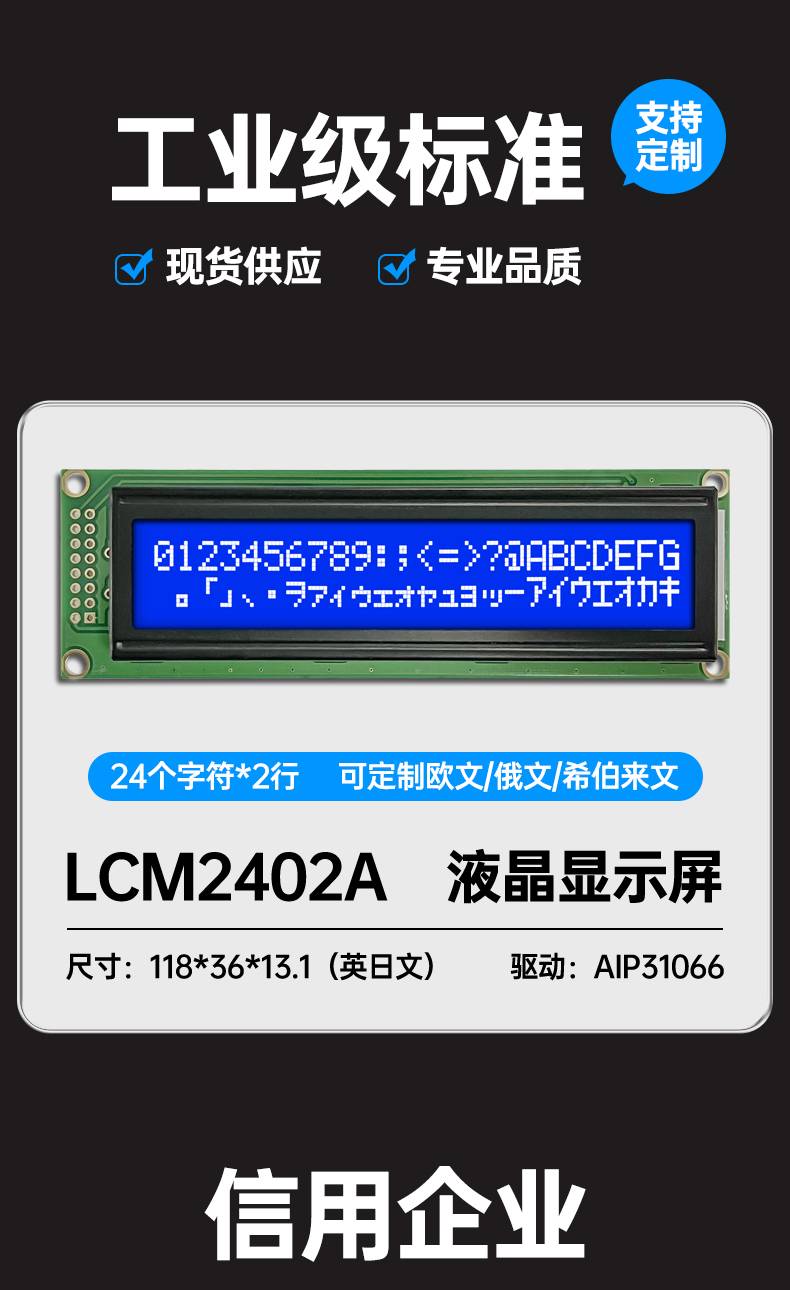 字符点阵LCM2402A液晶屏模块24个字符*2行蓝屏黄绿屏灰屏现货供应