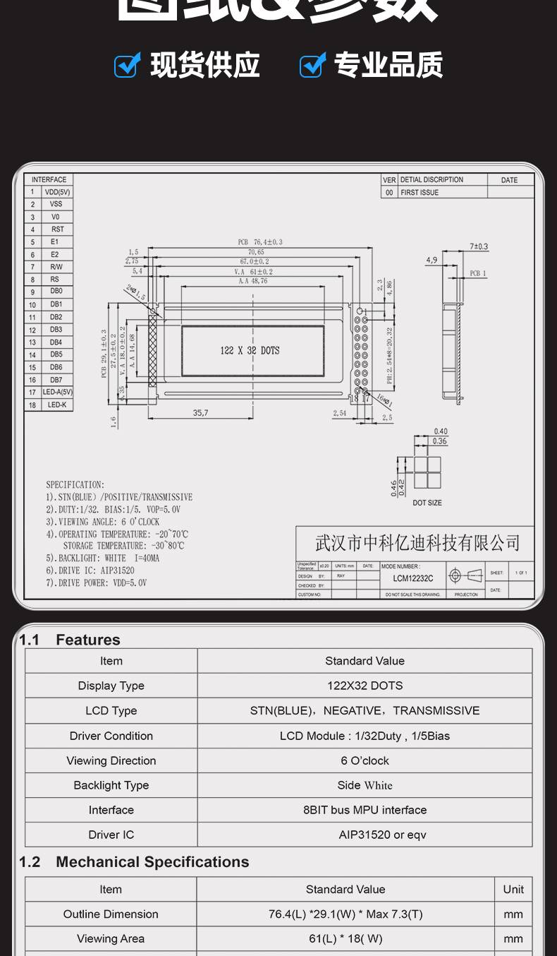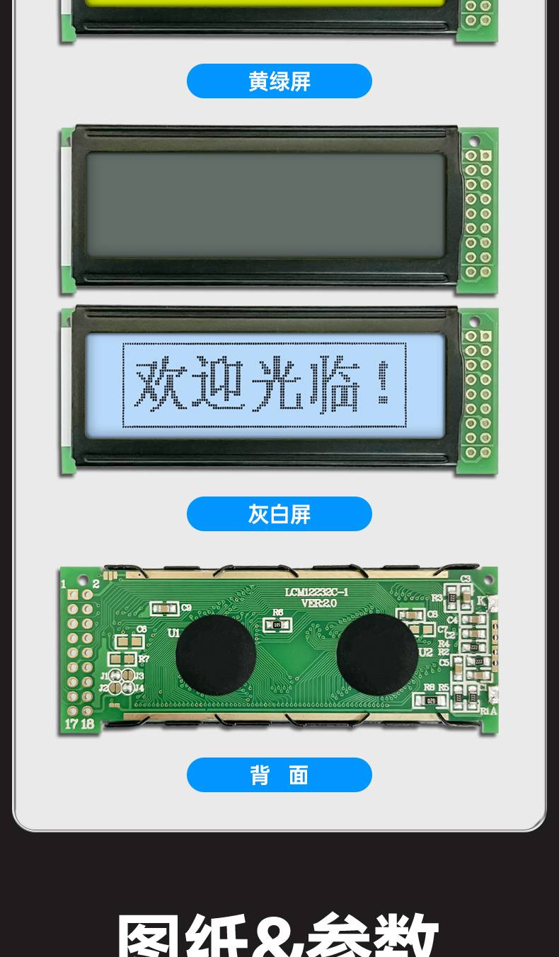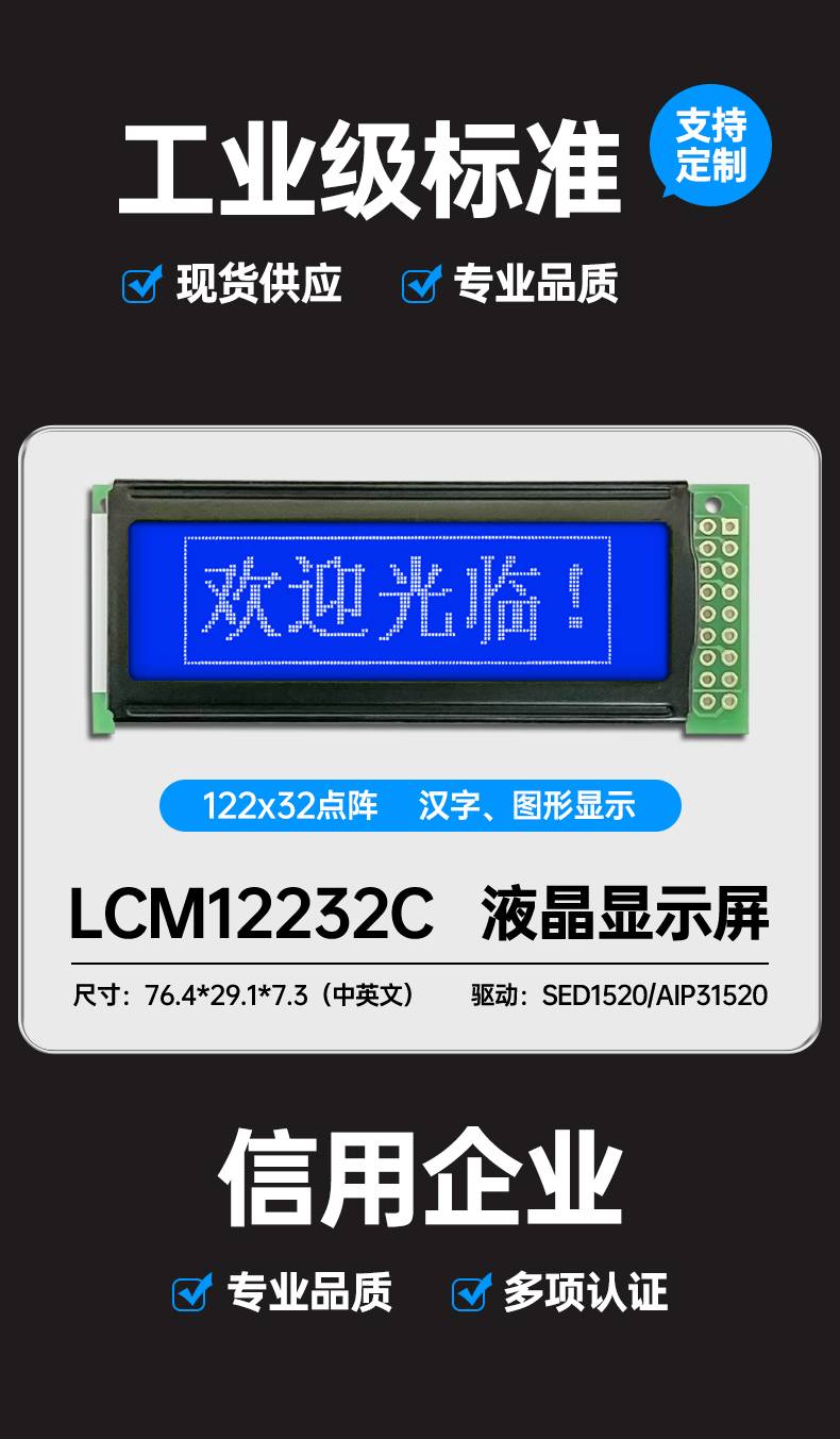 图形点阵LCM12232C液晶屏模块122*32蓝屏黄绿屏灰屏LCM模组3.3V5V