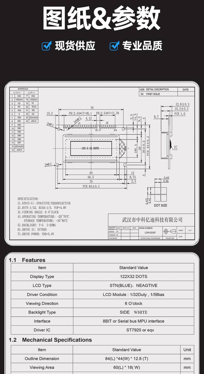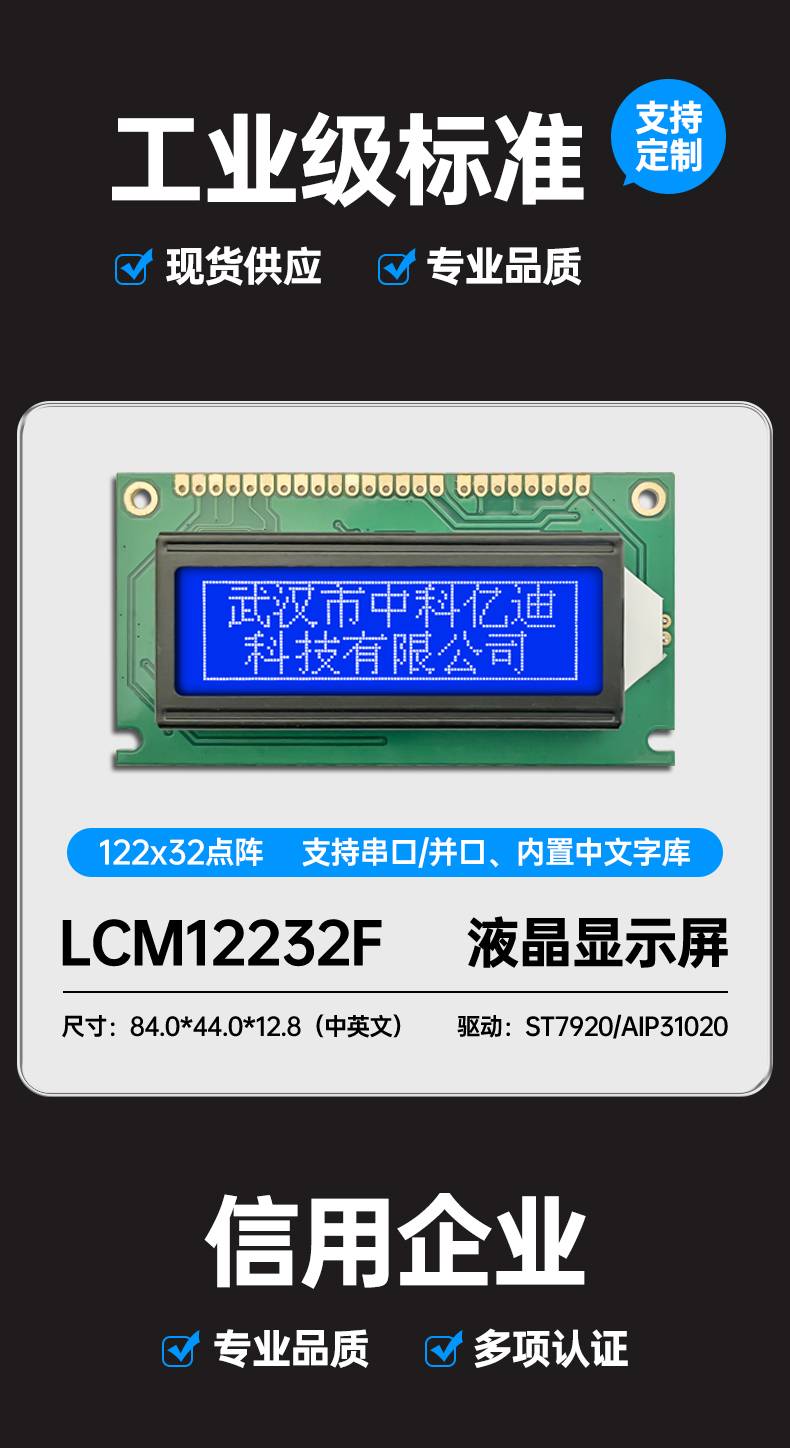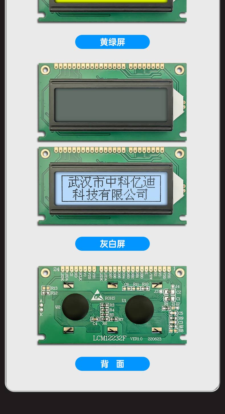 图形点阵LCM12232C液晶屏模块122*32蓝屏黄绿屏灰屏LCM模组3.3V5V