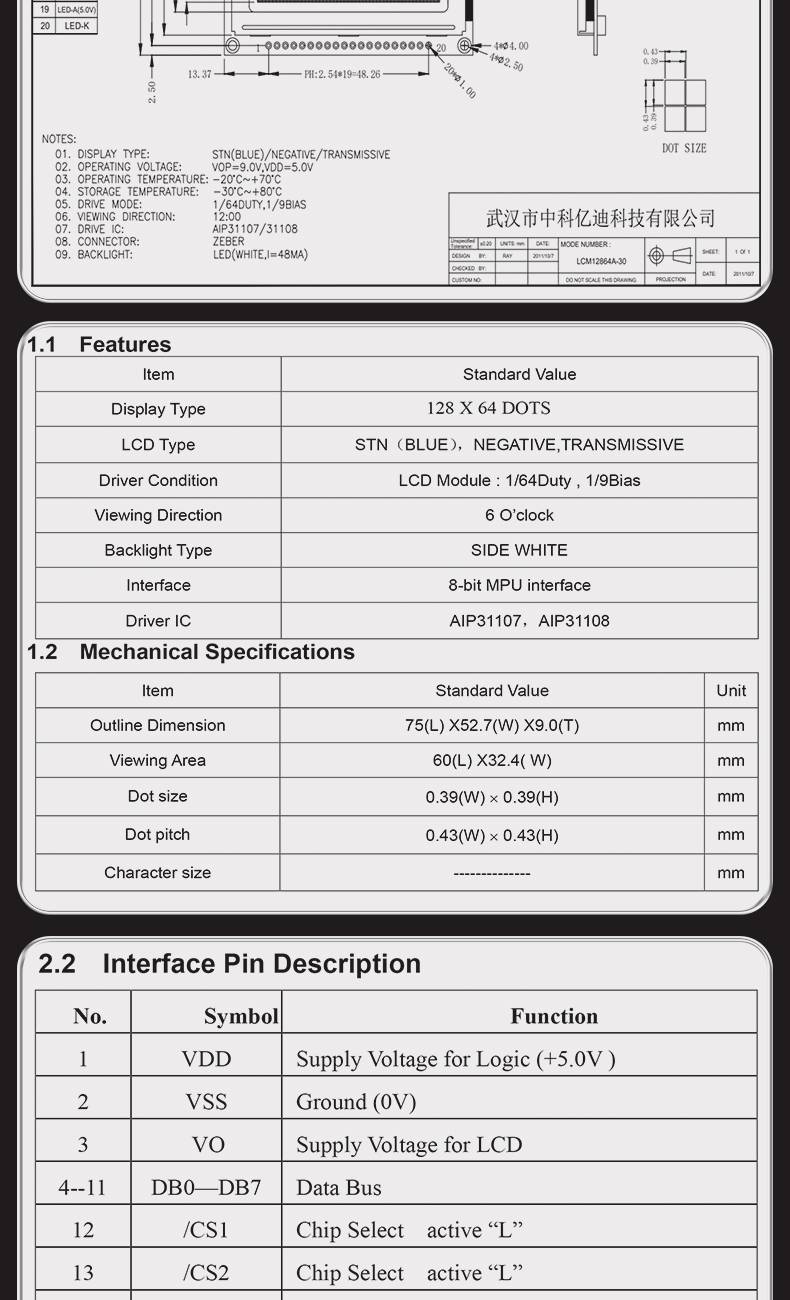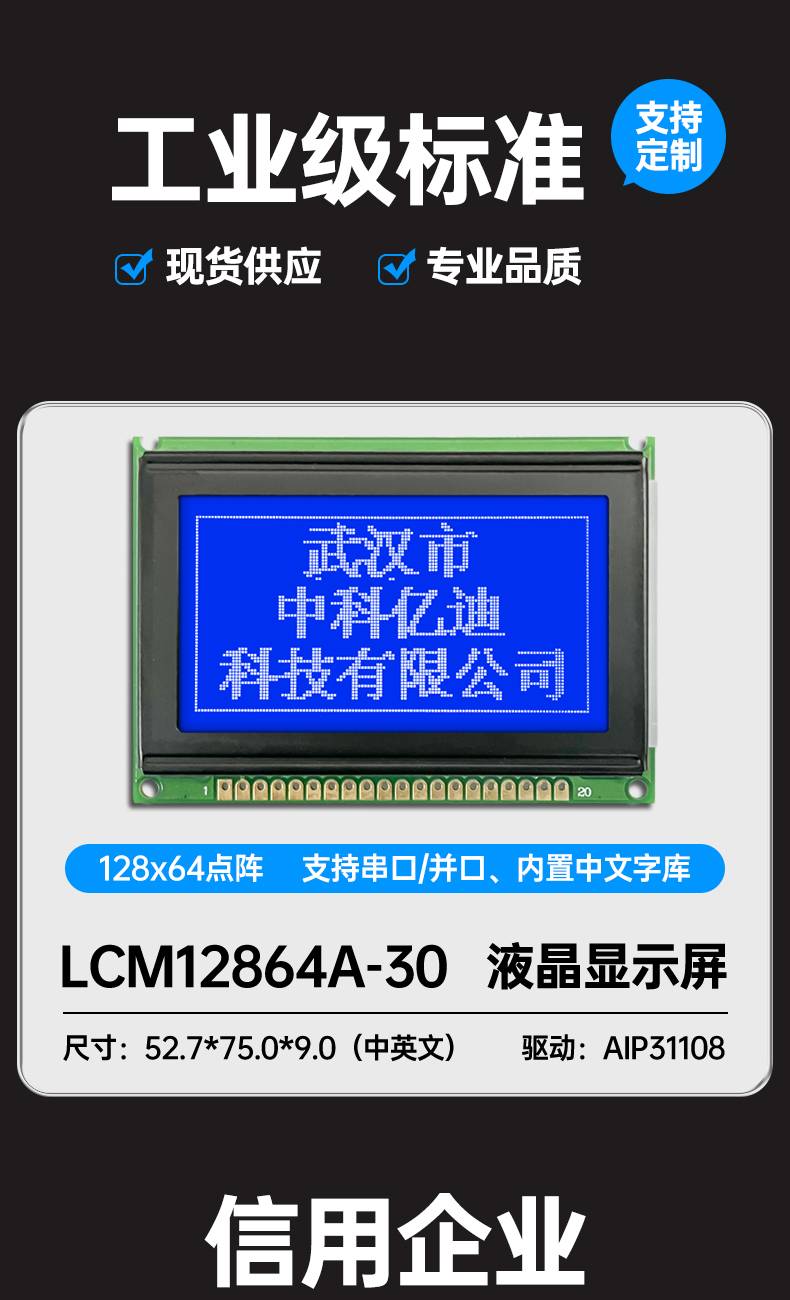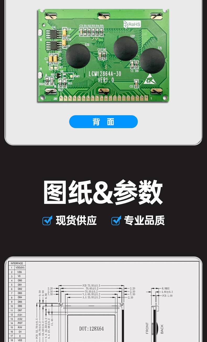 图形点阵LCM12864A-30液晶屏模块128*64点阵蓝屏黄绿屏灰屏中英文