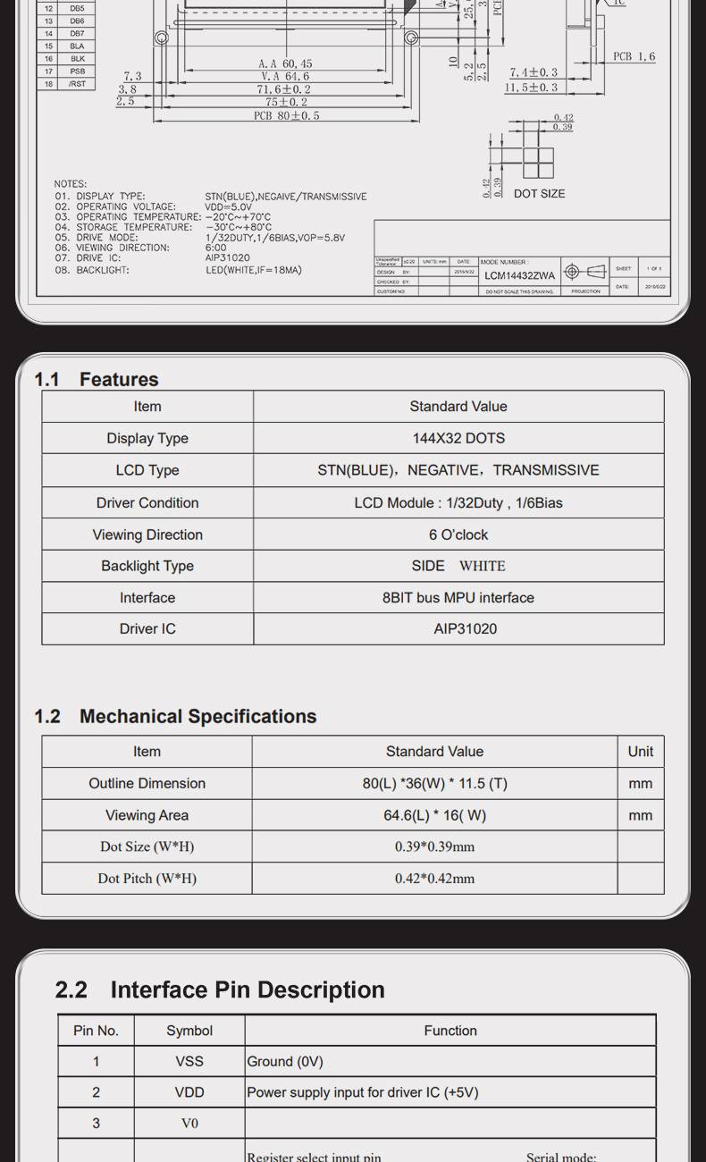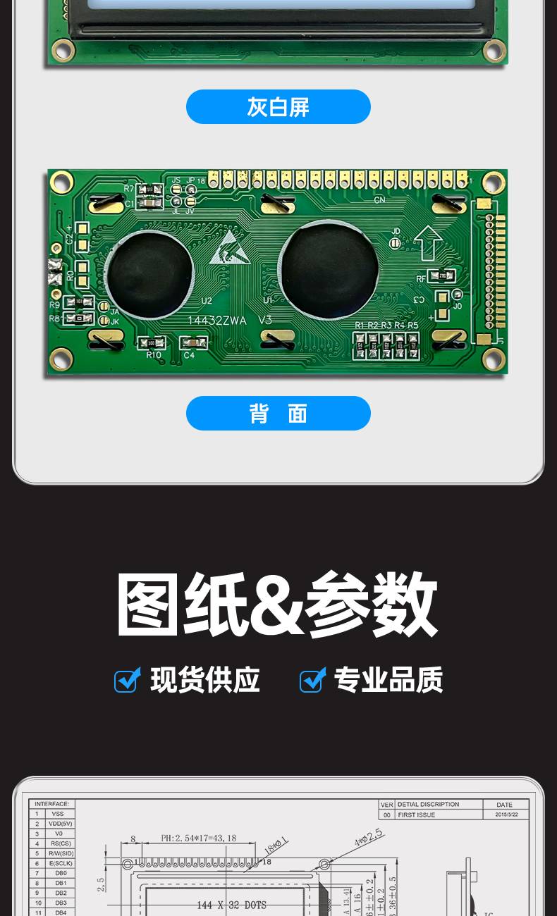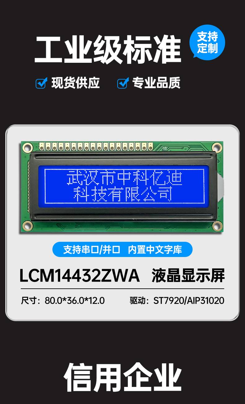 图形点阵LCM14432ZWA液晶屏144*32蓝屏黄绿屏灰屏LCM模组中文字库