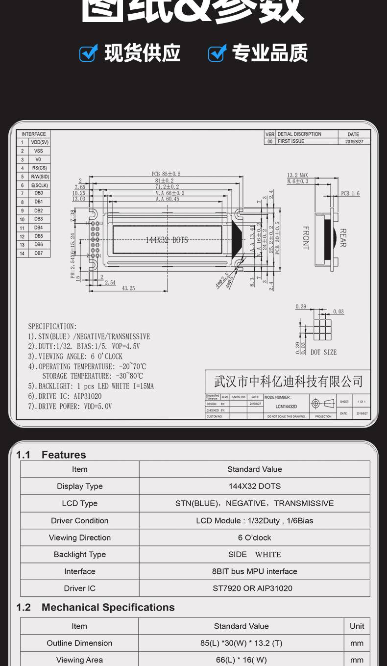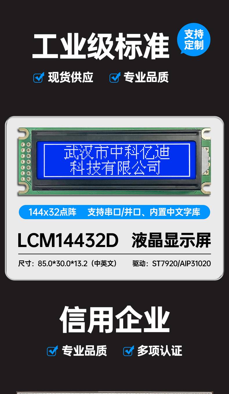 图形点阵LCM14432D液晶屏模块144*32点阵蓝屏黄绿屏灰屏中英文