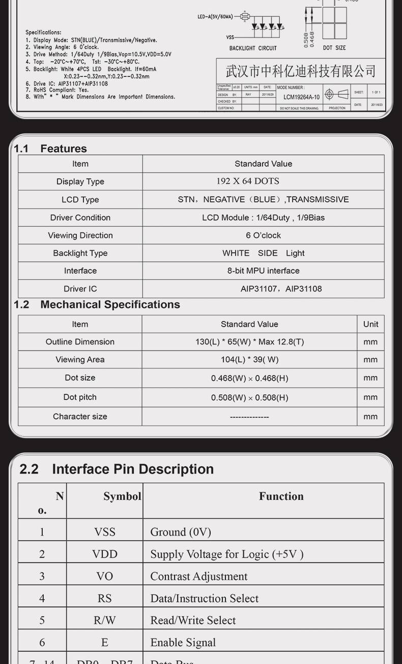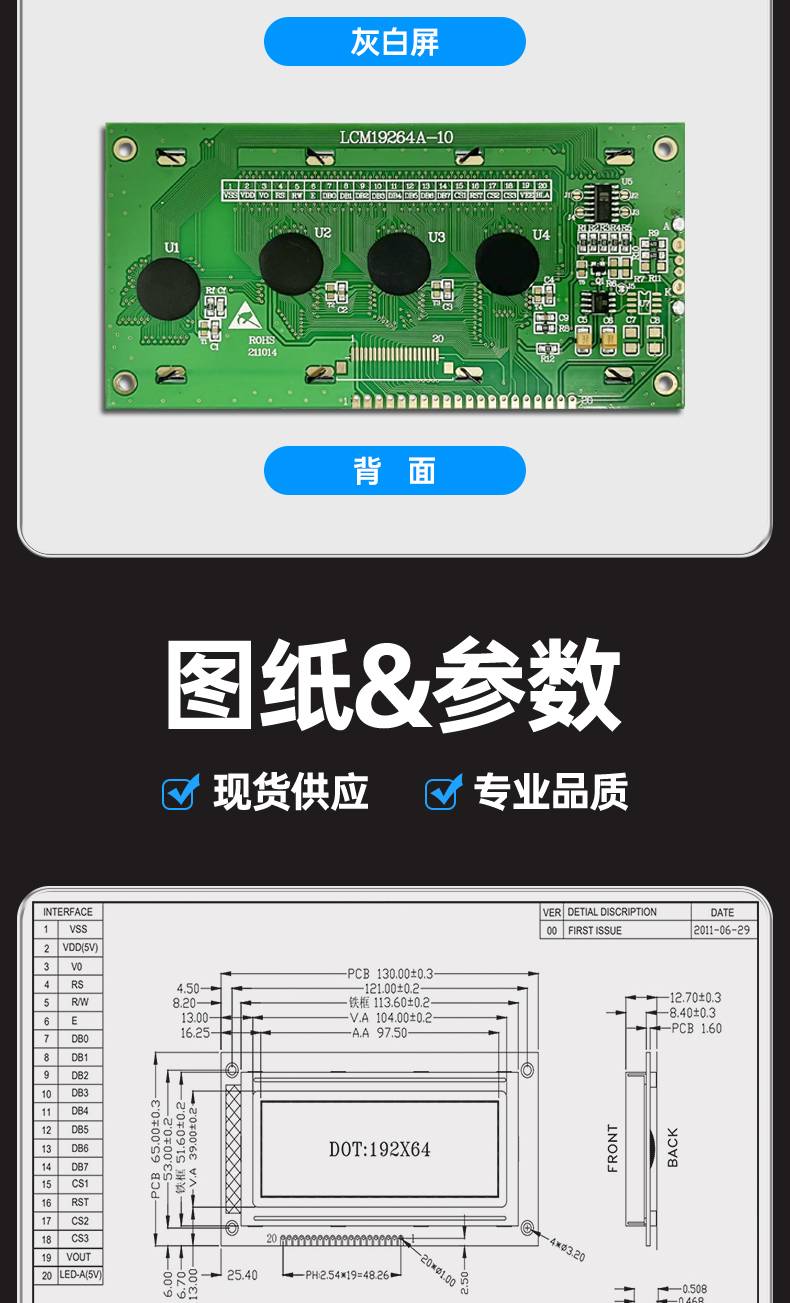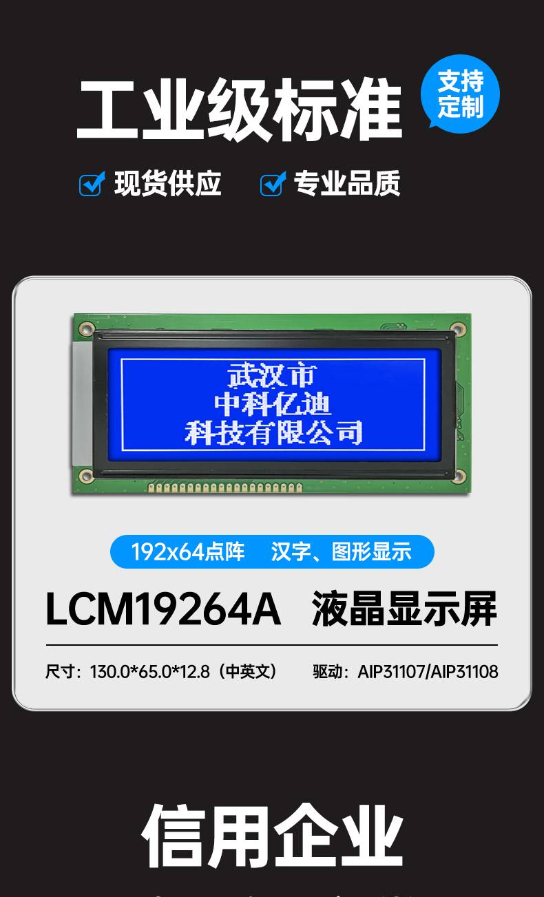 图形点阵LCM19264A液晶屏模块192*64 蓝屏黄绿屏灰屏汉字图形显示