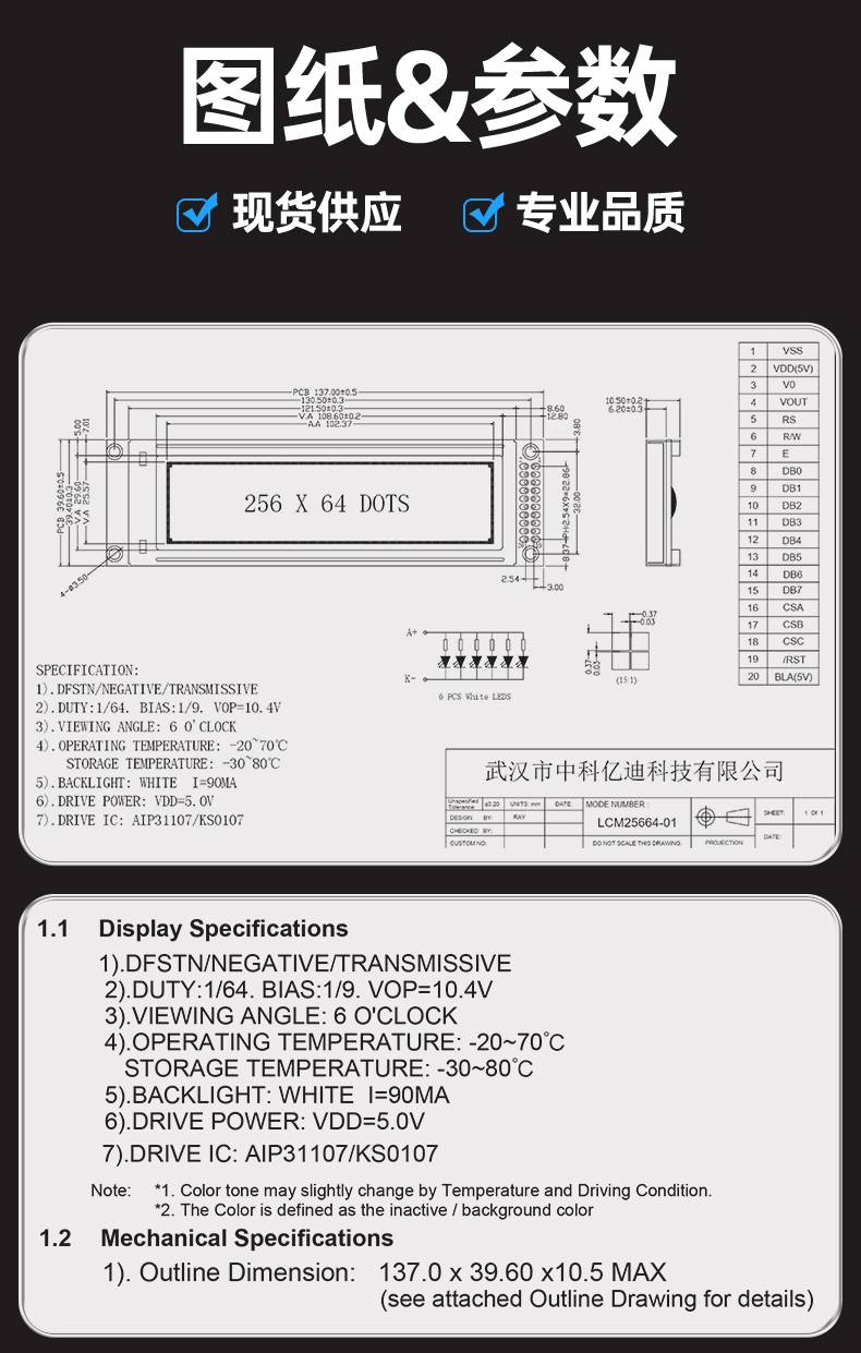 LCM25664-01图形点阵液晶屏模块LCD256*64显示屏图形汉字3.3V5V