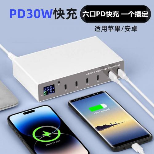 140W多口PD充电器6口数显PD30W快充适用于苹果安卓手机充电器