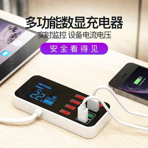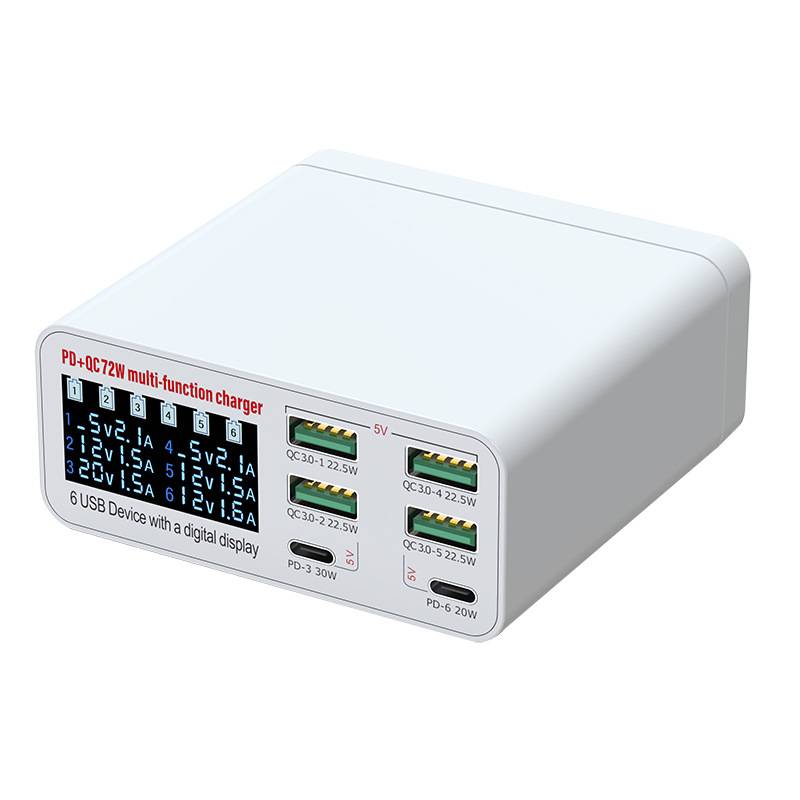 新品工厂直销6口智能数显独立显示72W大功率手机笔记本多口充电器