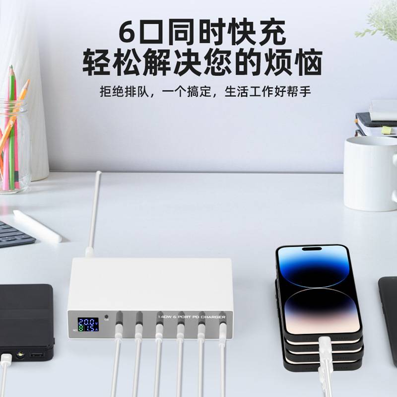 140W多口PD充电器6口数显PD30W快充适用于苹果安卓手机充电器