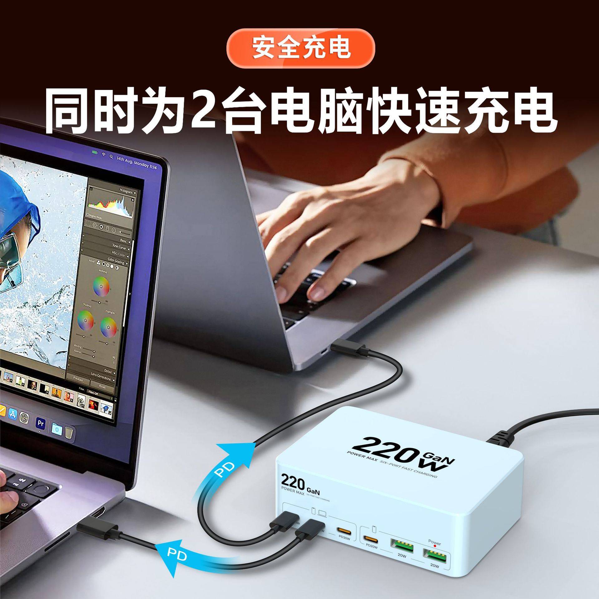 新款氮化镓智能多端口220W大功率笔记本电脑手机快充多口充电器