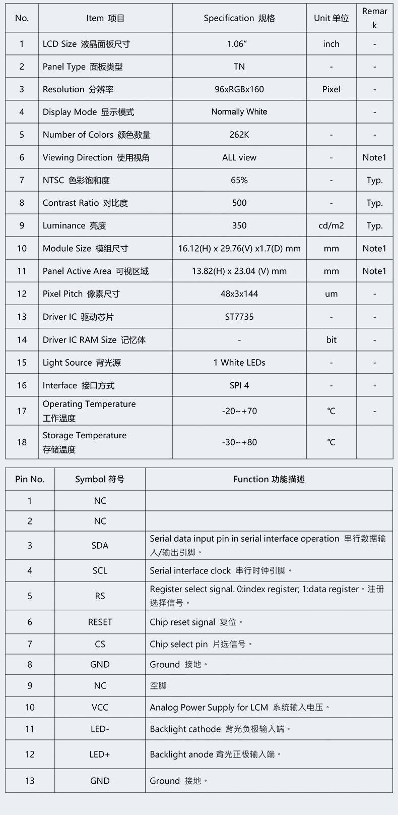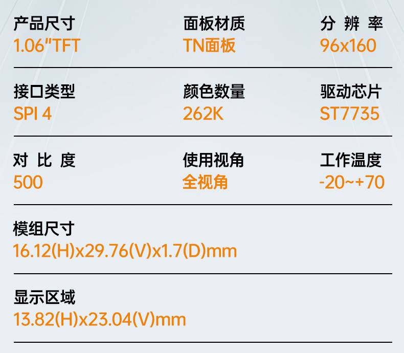 1.06寸TFT液晶屏分辨率96*160彩屏SPI高清彩色显示屏ST7735驱动