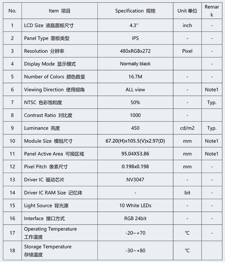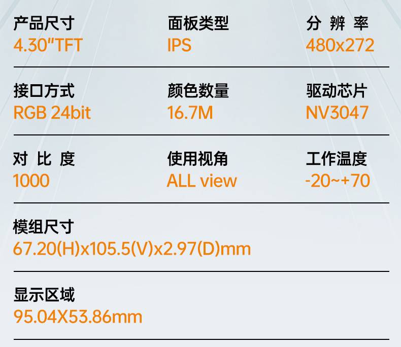 4.3寸TFT液晶屏480*272分辨率IPS高清彩色显示屏NV3047驱动现货