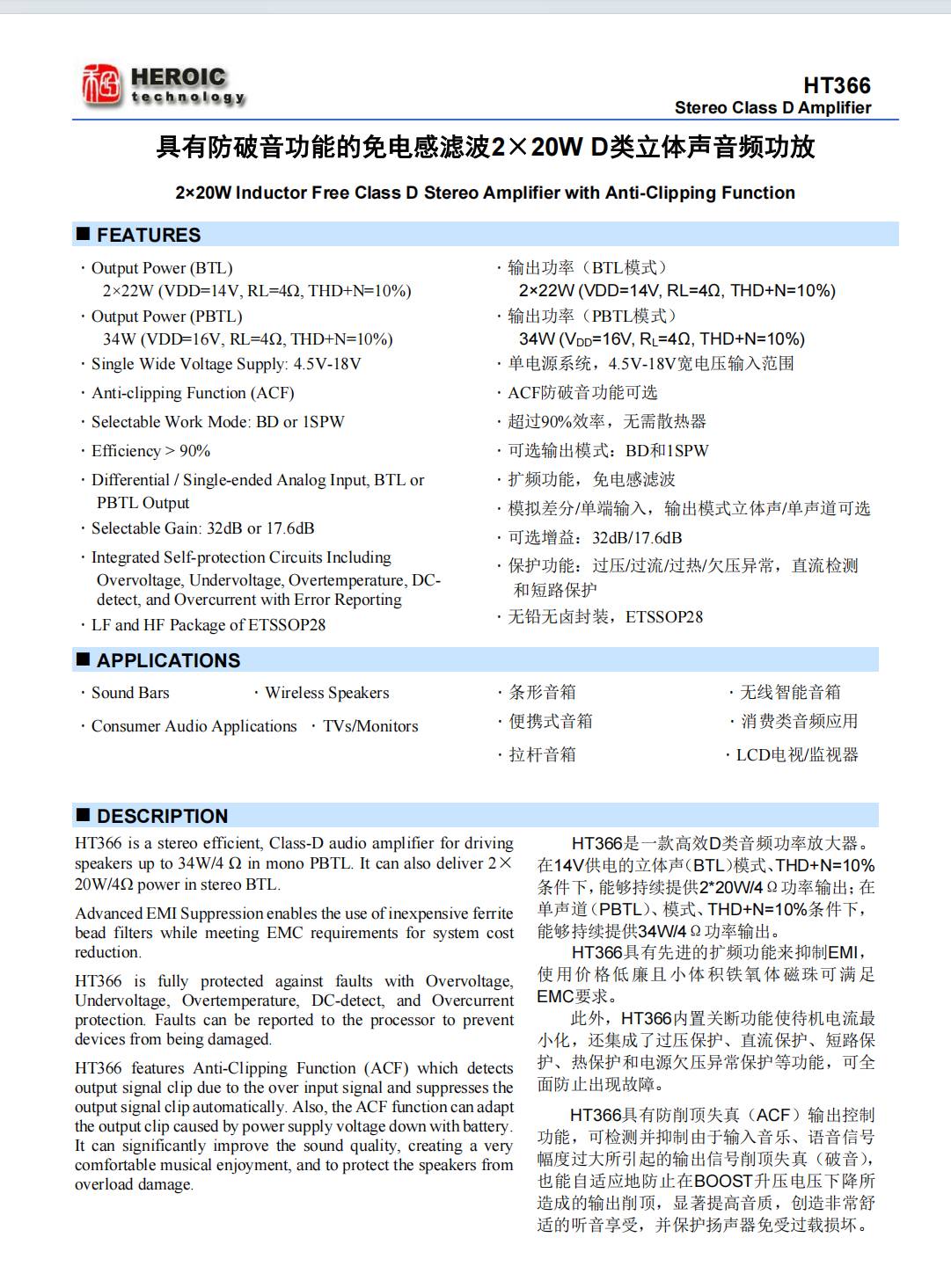 HT97180 125mW免输出耦合电容的立体声线路驱动器/耳机放大器