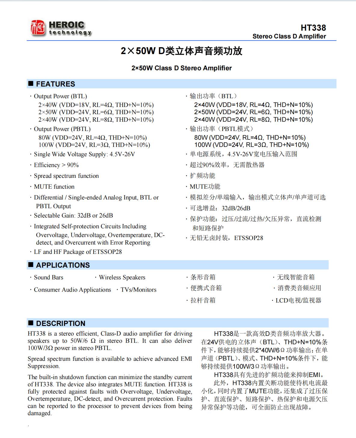 HT6873 6W高保真超低EMI防削顶单声道D类音频功率放大器