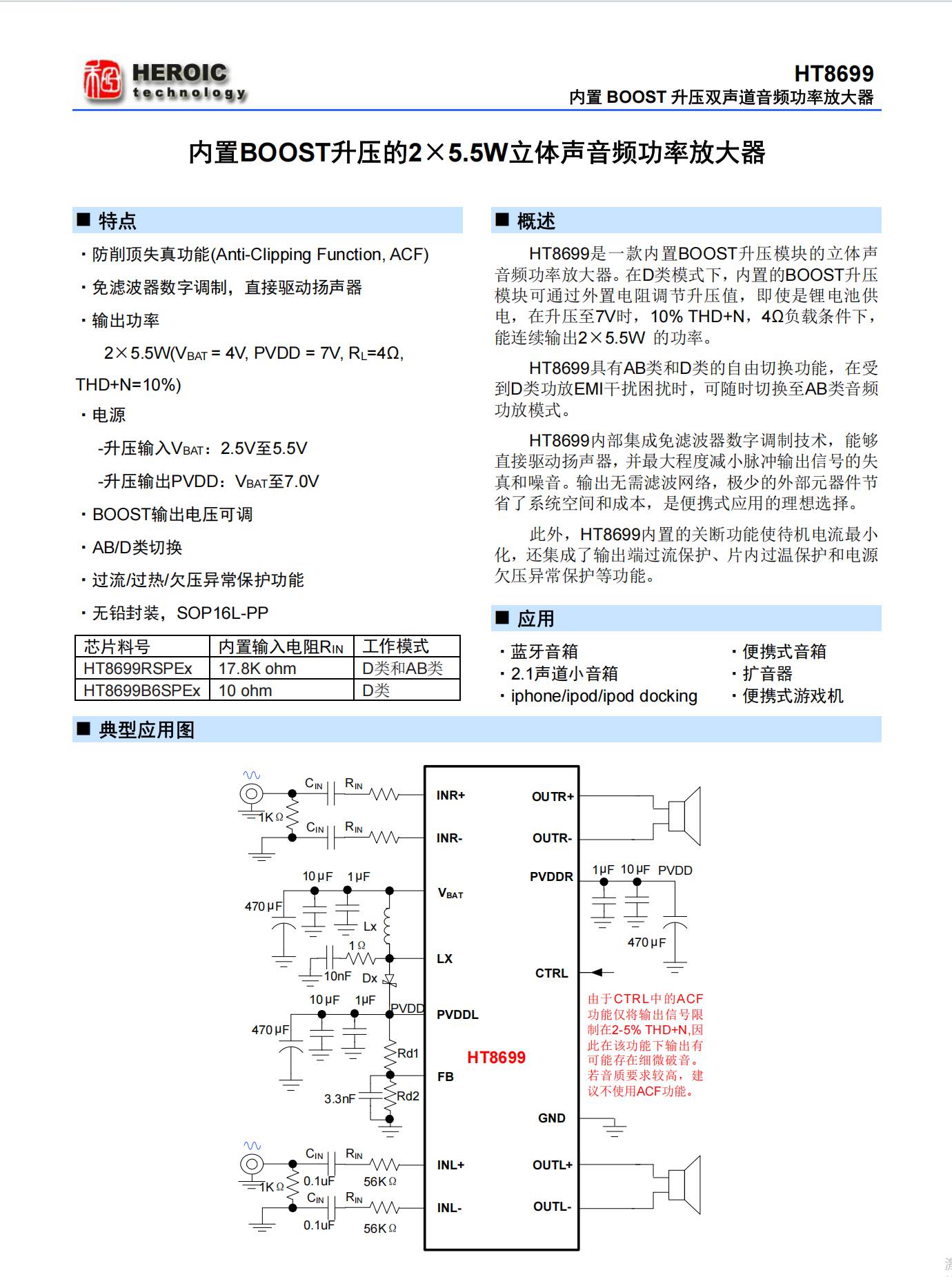 HT6873 6W高保真超低EMI防削顶单声道D类音频功率放大器