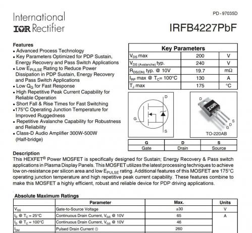 IRFB4227PBF 英飞凌原装场效应管二三极管 MOSFET, N, 200V, 65A, TO-220AB
