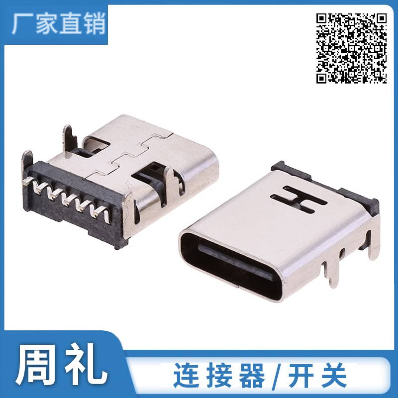 USB 3.1TYPE-C 6P 母座 90度卧式四脚插板带弹L6.5-6.8MM DIP_SMT