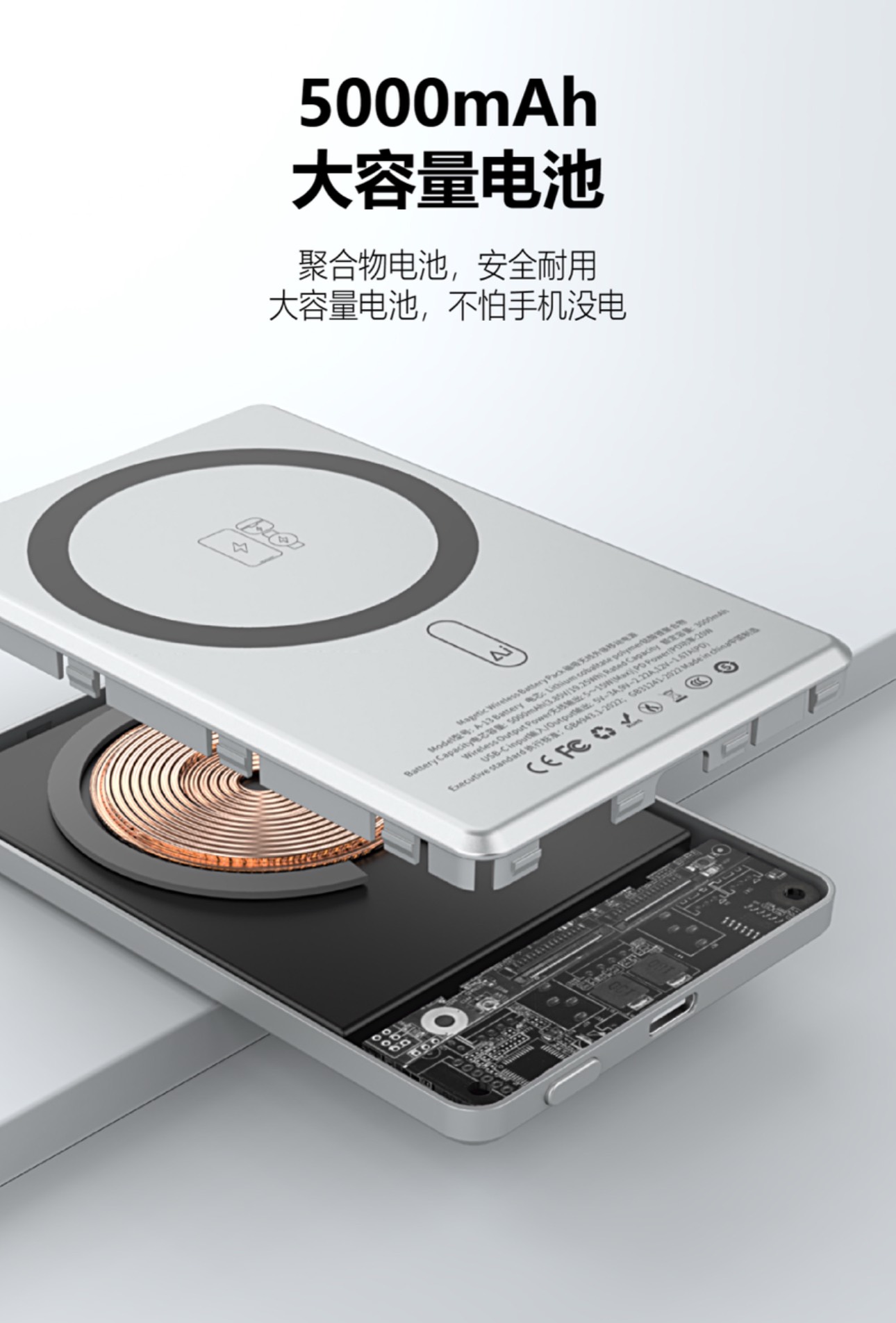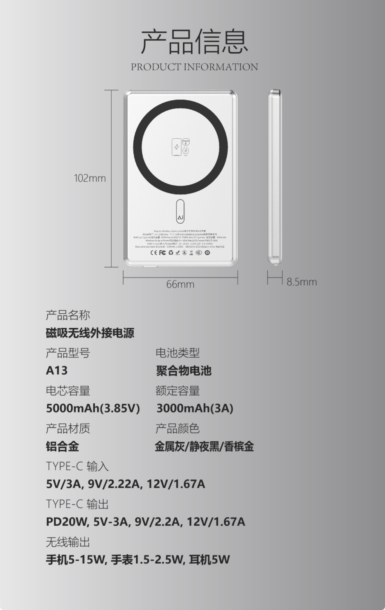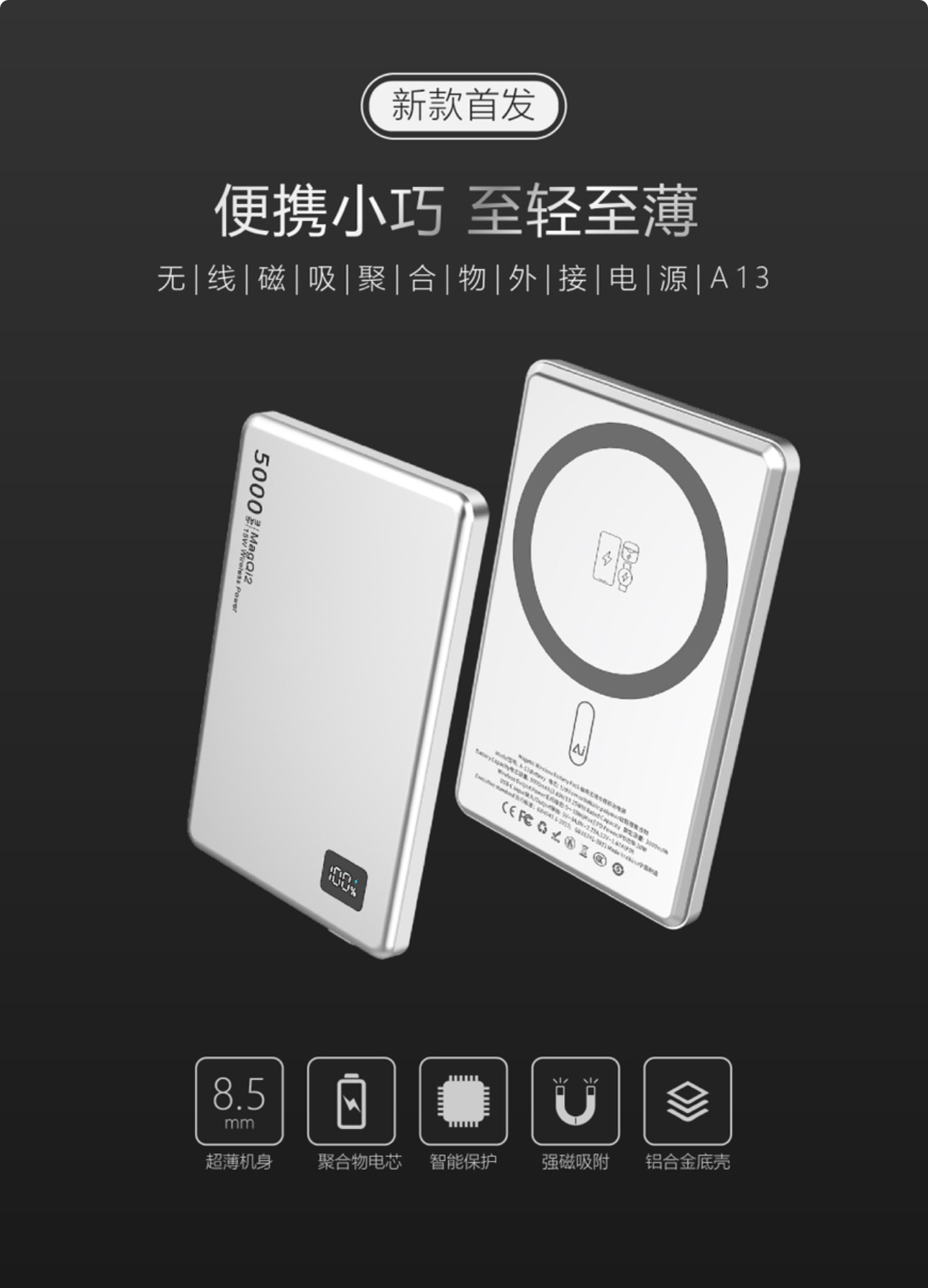 跨境电商私模超薄磁吸A13无线充电宝5000mAh