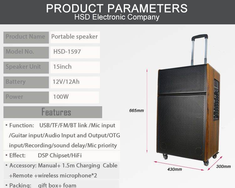 4.Lead acid Battery:12V7A 5.Metal Net 6.Accessories:AC charger line++UFH wireless mic*2+remote+Instruction 7.Packing:Brown box +Foam