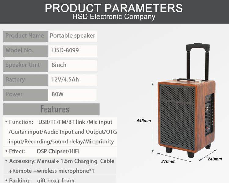 4.Lead acid Battery:12V4.5A 5.Metal Net 6.Accessories:AC charger line++VHF wireless mic*1+remote+Instruction 7.Packing:Brown box +Foam