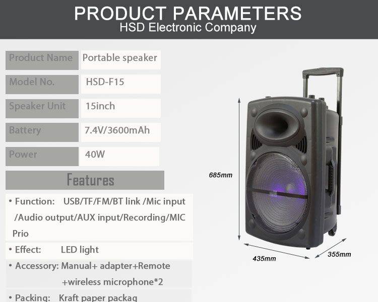 4.Battery:7.4V3600MAH 5.Effect:LED light 6.Accessories::Adapter charger+wireless mic*2+remote+Instruction 7.Packing:Color box +Foam