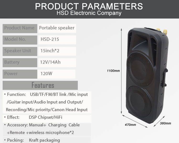 4.Battery:12V12A 5.Effect:no light 6.Accessories::Adapter charger+wireless mic*2+remote+Instruction 7.Packing:Color box+Foam