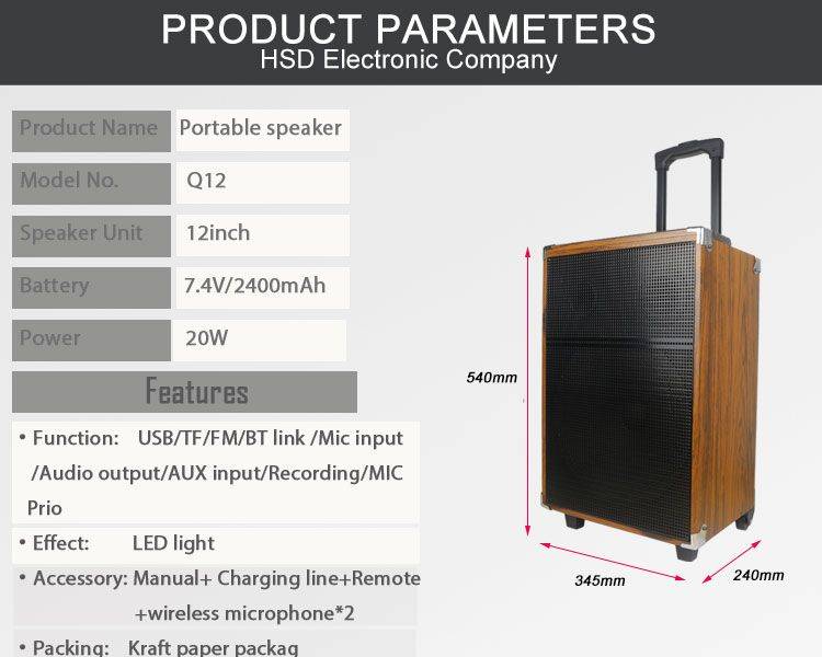 4.Lead acid Battery:12V7A 5.Metal Net 6.Accessories:AC charger line+ wireless mic*2+remote+Instruction 7.Packing:Brown box +Foam