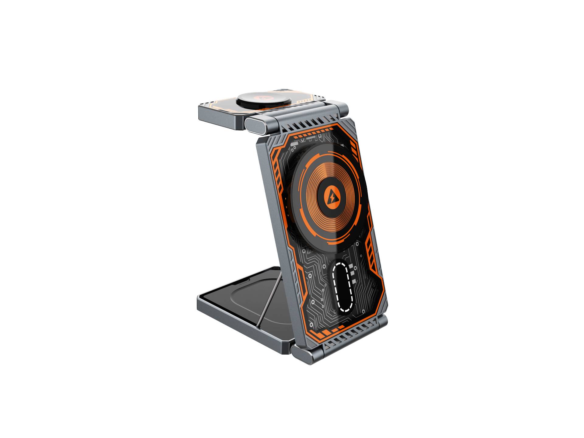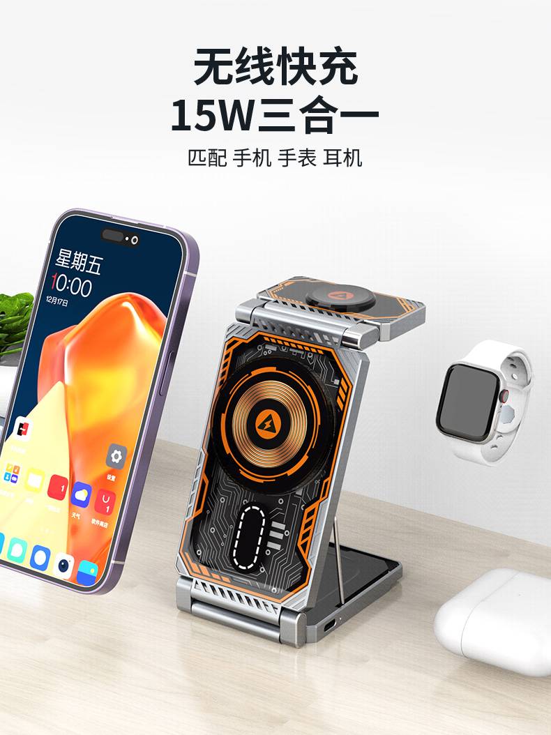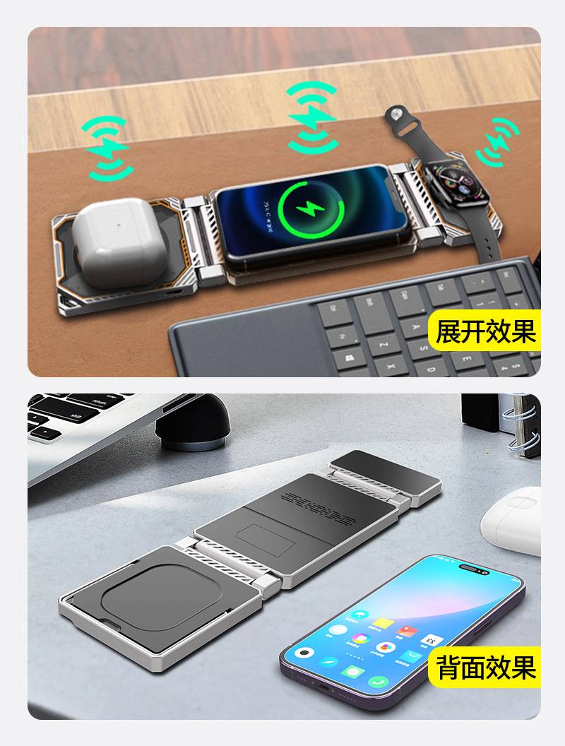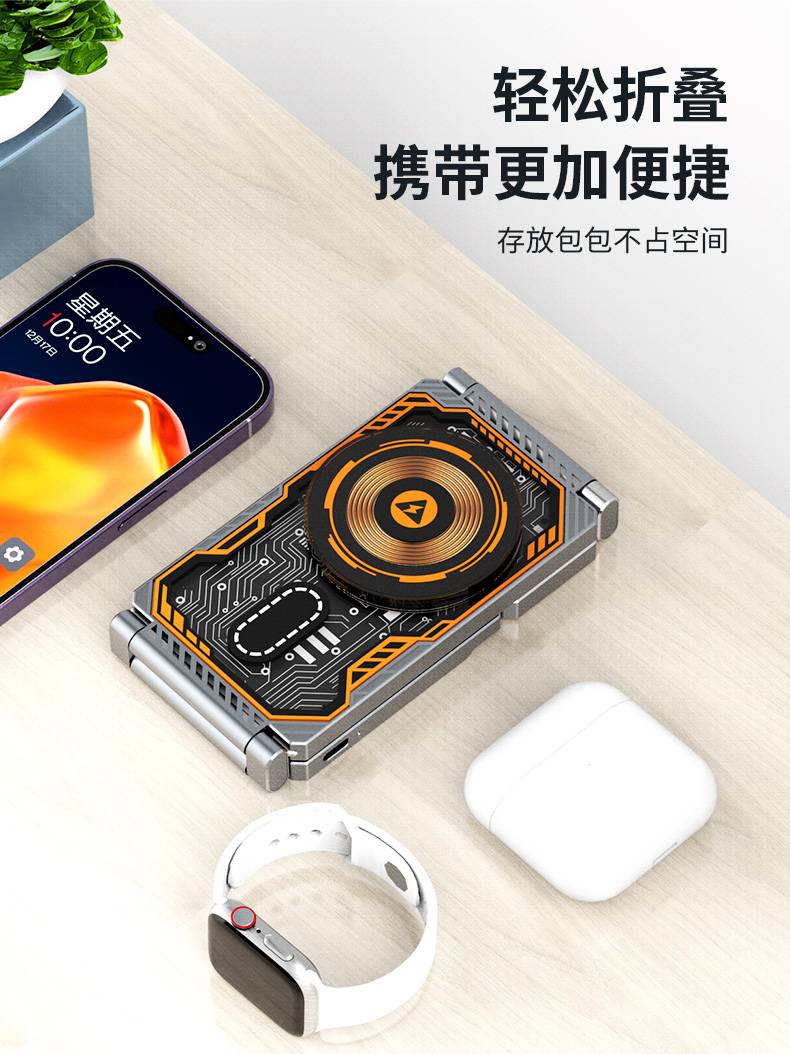 1.Wireless charging station is designed with a strong magnetic "external magnetic wing" stand, which can be folded and supports four charging modes