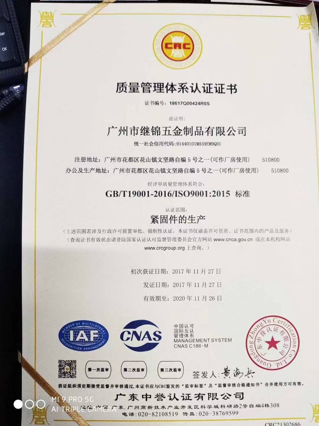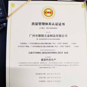 继锦人用不懈的追求和过硬的质量在短短的时间内发展迅猛。公司采用及国内的螺丝生产设备,拥有一队从事螺丝行业数多年之精英团队,并已积累多年的螺丝生产制造经验。今天的质量是我们明天的生存,为保证良好的品质,公司已通过ISO质量管理体系认证,严格按照ISO质量体系控制生产过程。标准紧固件螺丝月生产能力1.2~1.5亿颗。可以满足客户需求和质量的各种要求。