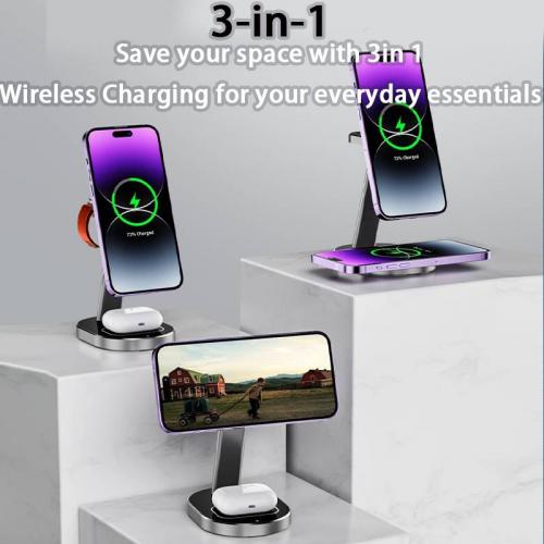 Three in one metal wireless charging base rotating 15W magnetic wireless charger bracket fast charging MX-CD12S