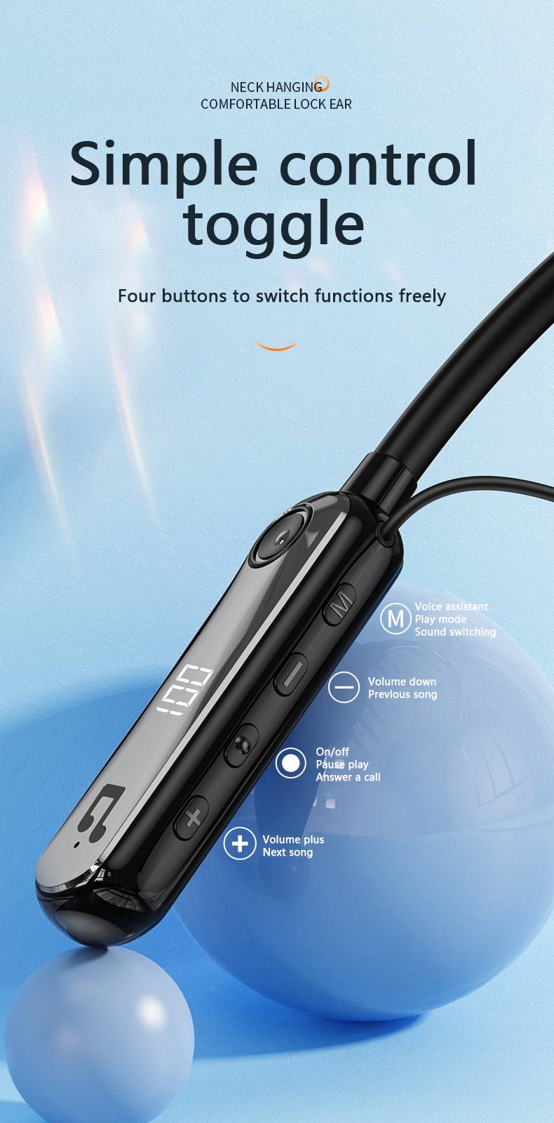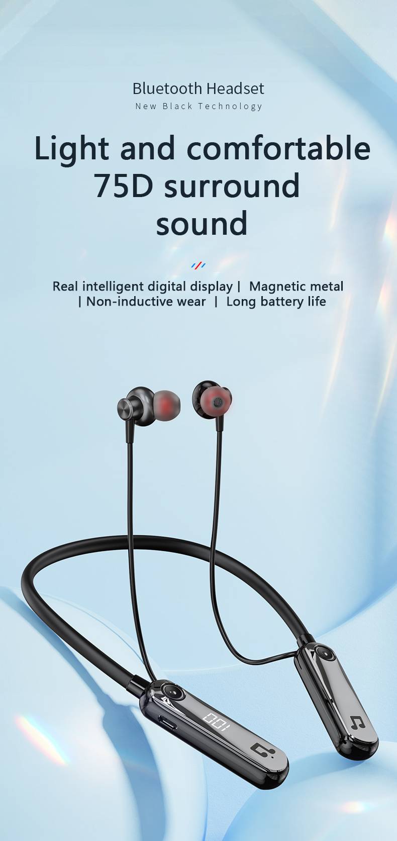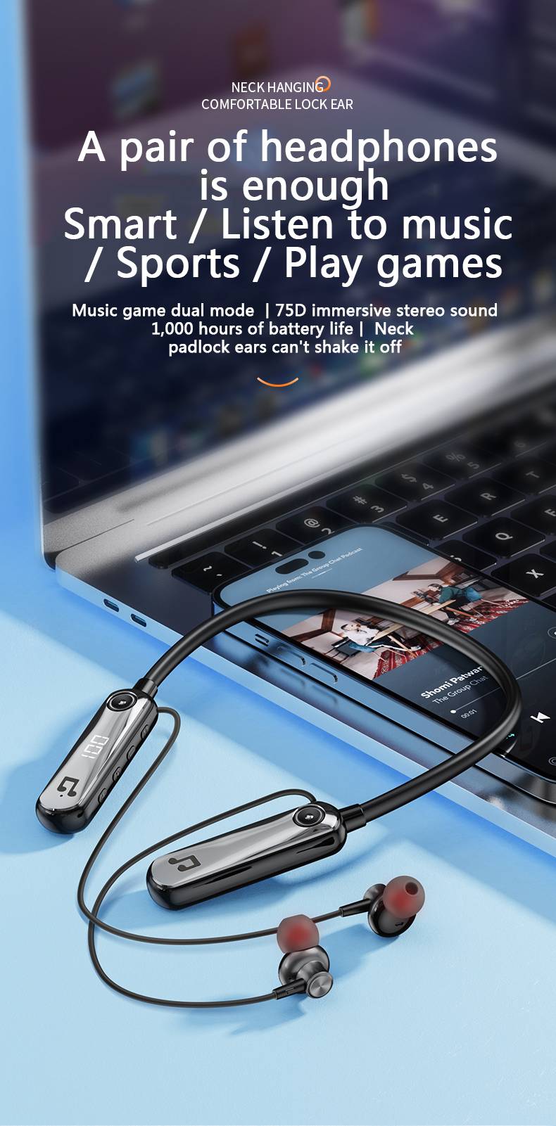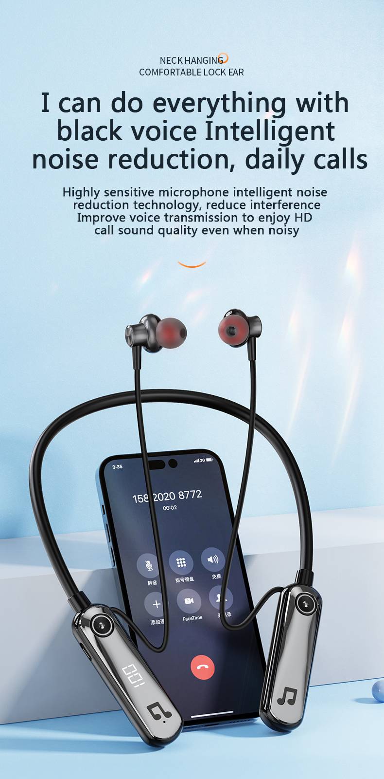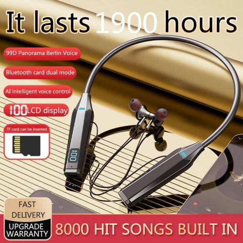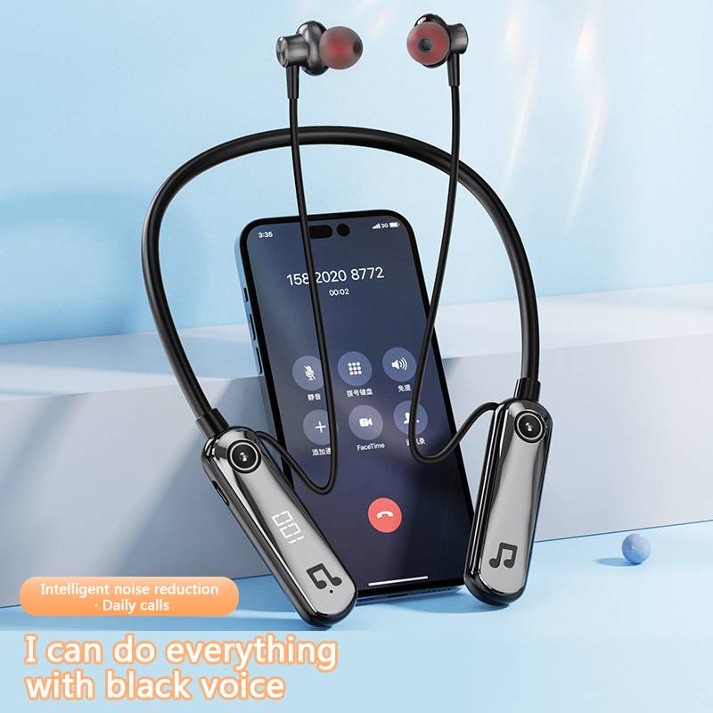 Wireless Bluetooth 5.3 neck hanging in ear headphones with AI voice control, long battery life with digital display, spo
